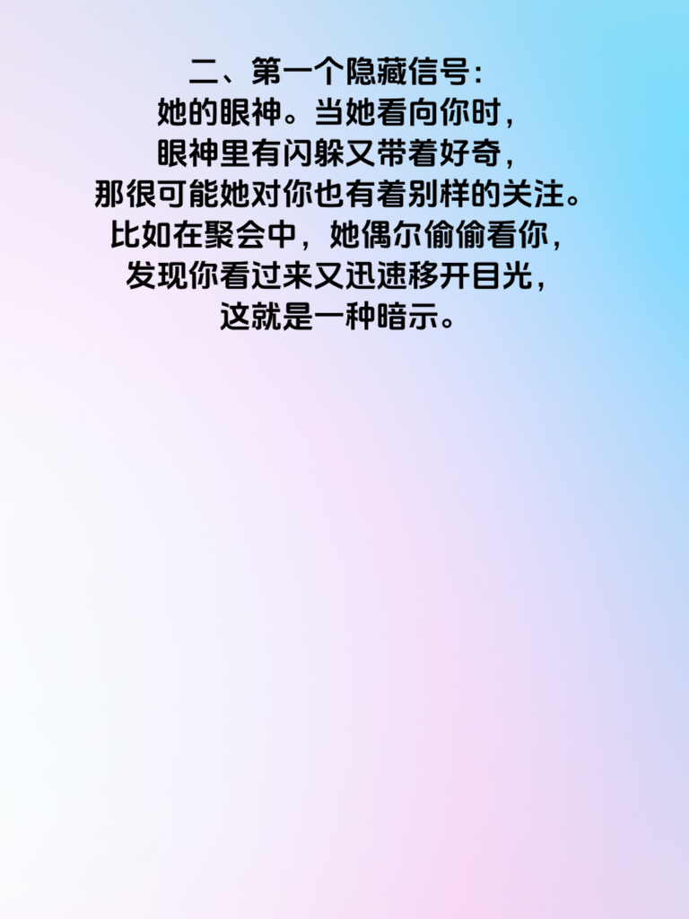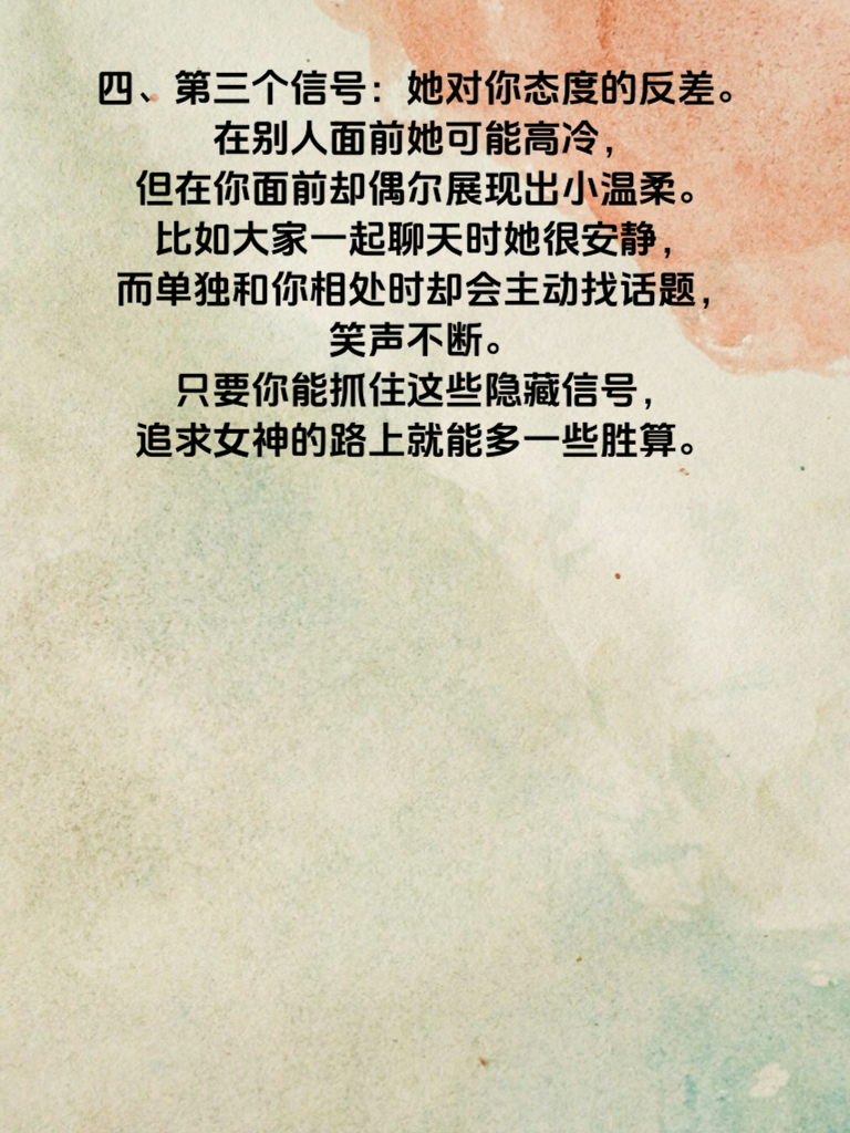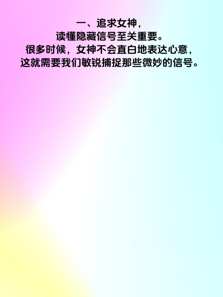 一、追求女神,读懂隐藏信号至关重要。很多时候,女神不会直白地表达心意,这就需要我们敏锐捕捉那些微妙的信号。 二、第一个隐藏信号:她的眼神。当她看向你时,眼神里有闪躲又带着好奇,那很可能她对你也有着别样的关注。比如在聚会中,她偶尔偷偷看你,发现你看过来又迅速移开目光,这就是一种暗示。 三、第二个信号:她的分享欲。如果她总是主动和你分享生活中的点滴,无论是有趣的事还是小烦恼,那说明她在心里已经把你当成特别的人。比如她会跟你讲今天遇到的可爱小动物,或者工作上的小困扰。 四、第三个信号:她对你态度的反差。在别人面前她可能高冷,但在你面前却偶尔展现出小温柔。比如大家一起聊天时她很安静,而单独和你相处时却会主动找话题,笑声不断。只要你能抓住这些隐藏信号,追求女神的路上就能多一些胜算。