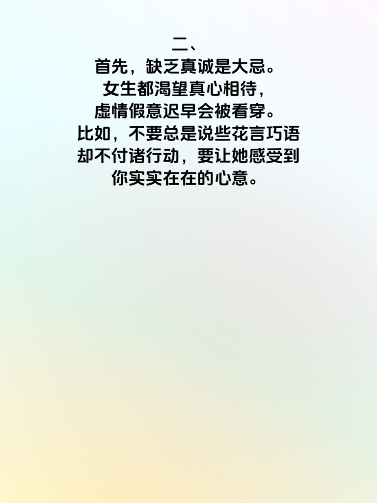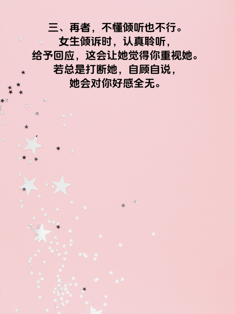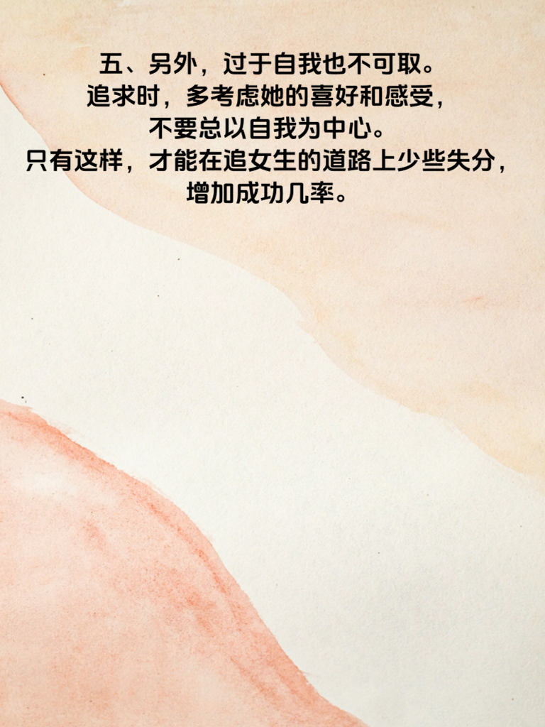 一、在追求女生的过程中,有些技巧是男人必须掌握的,否则很容易失分。 二、首先,缺乏真诚是大忌。女生都渴望真心相待,虚情假意迟早会被看穿。比如,不要总是说些花言巧语却不付诸行动,要让她感受到你实实在在的心意。 三、再者,不懂倾听也不行。女生倾诉时,认真聆听,给予回应,这会让她觉得你重视她。若总是打断她,自顾自说,她会对你好感全无。 四、还有,不注意细节会失分。比如约会迟到、礼物随意等。细节之处见真心,用心对待每个相处瞬间,才能赢得她的心。 五、另外,过于自我也不可取。追求时多考虑她的喜好和感受,不要总以自我为中心。只有这样,才能在追女生的道路上少些失分,增加成功几率。