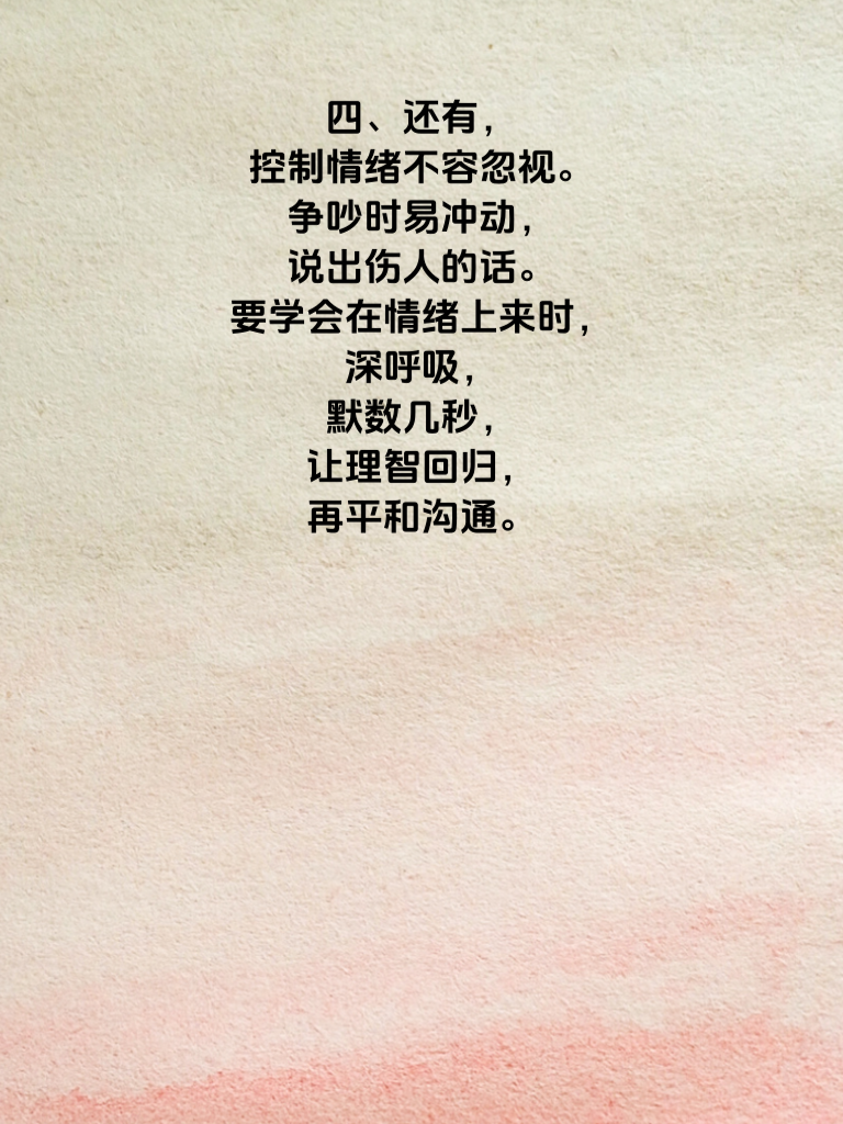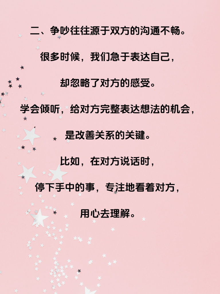 一、夫妻之间争吵频繁,婚姻仿佛置身于风雨飘摇之中,岌岌可危。每一次的争吵都像是在婚姻的堤坝上凿出一道裂缝,若不及时修补,终将溃堤。 二、争吵往往源于双方的沟通不畅。很多时候,我们急于表达自己,却忽略了对方的感受。学会倾听,给对方完整表达想法的机会,是改善关系的关键。比如,在对方说话时,停下手中的事,专注地看着对方,用心去理解。 三、尊重差异也极为重要。夫妻来自不同家庭,有不同观念和习惯。不要强行改变对方,而是接纳并欣赏。像生活习惯不同,不妨相互妥协,找到平衡。 四、还有,控制情绪不容忽视。争吵时易冲动,说出伤人的话。要学会在情绪上来时深呼吸,默数几秒,让理智回归,再平和沟通。 五、若想拯救岌岌可危的婚姻,需双方共同努力,用心经营,用爱修补每一道裂缝,让婚姻重回温暖港湾。