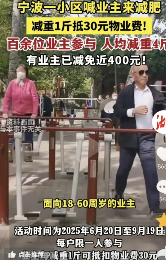 浙江宁波某小区这招厉害呀,一石二鸟!宣布:每个家庭,可以派出一位业主参加活动,减肥1斤,抵30元物业费,没有上限,年龄在18-60岁,时间6月20-9月19,业主纷纷报名。