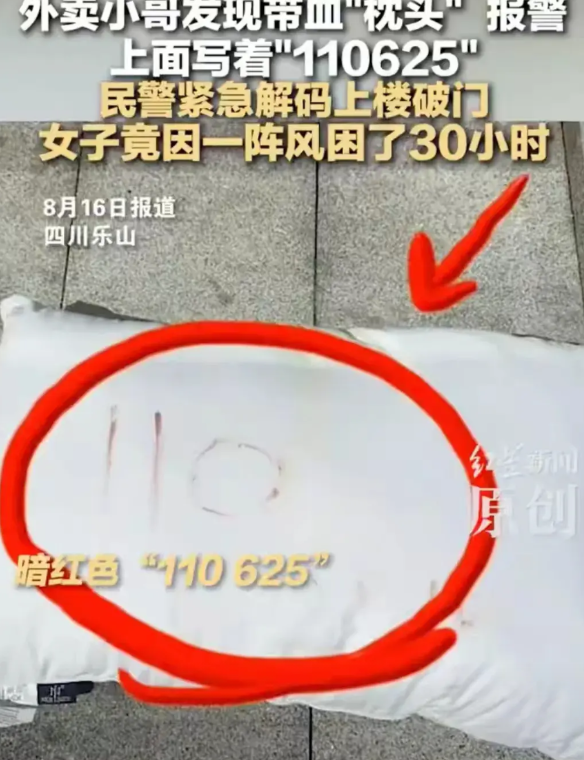四川乐山房东周女士在打扫房间时,一阵风意外将她反锁在卧室内。门锁故障无法打开,手机又遗落在客厅,她陷入绝境。在近30小时的被困后,求生欲驱使她咬破手指,用鲜血在白色枕头上写下“110625”,意为向110求救,位置是6号楼25楼,奋力将枕头从窗户抛下。