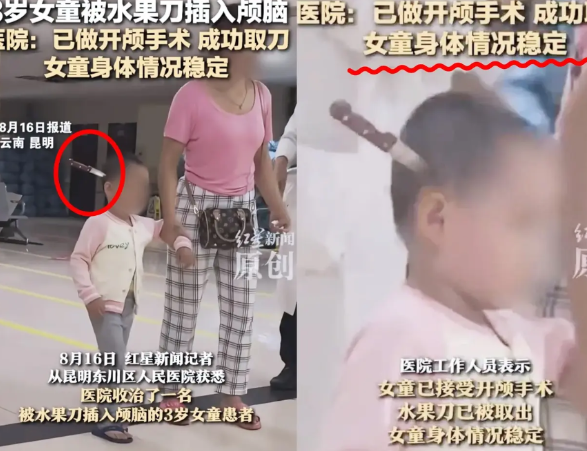 好在送医及时,经过紧急开颅手术,医生成功将刀子取出,目前女童生命体征平稳。