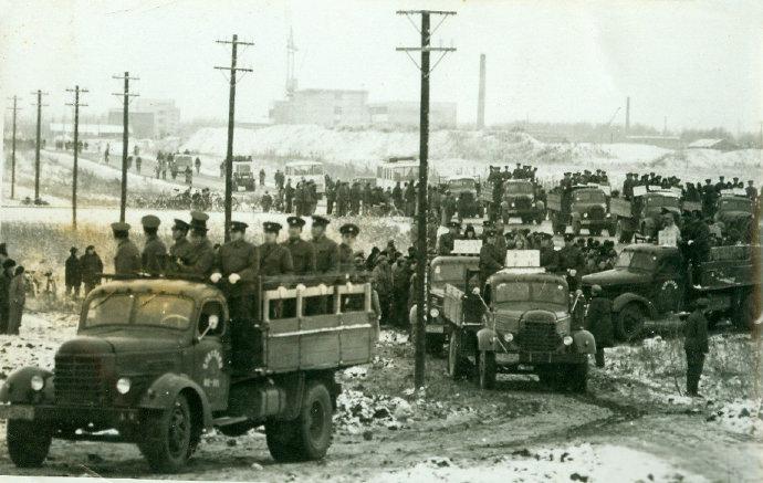 83年严打期间,武警押送死刑犯赴刑场照片。冬季,大雪纷飞,郊外的公路上几辆侧三轮摩托车开道,武警和死刑犯都站在老解放卡车上,沿途有很多围观群众,气氛肃杀。