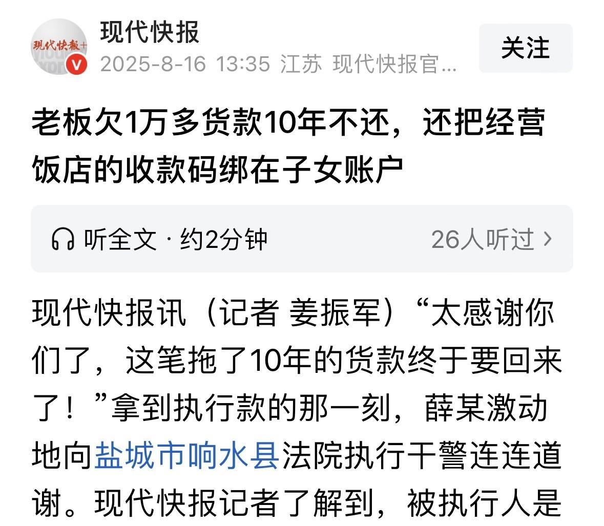 江苏盐城,男子给一客户供货,对方欠了快20000的货款迟迟不还,男子多次催款,对方还了100块就把他打发了,男子气够呛,直接诉至法院,还走到强制执行这一步,结果对方还是拒不配合,说自己没钱还,就在案子陷入僵局时,执行人员发现欠款人偷摸经营着一家餐厅,完全有还款能力,为了隐藏财产,对方还做出一件让人哭笑不得的事。 8月16号,据现代快报报道,2023年的一天,法院执行局走廊里,58岁的薛某攥着刚收到的执行款,眼眶泛红。 他感叹道:这钱我要了八年,今天总算见到回头钱了。 时间回到2014年春天,薛某和杜某签下每月结算的供货合同,起初合作还算顺利。可后来,杜某总是不按时交付货款,最后累计欠下19800元。 都乡里乡亲的,薛某信任对方,只说让他尽快还钱,哪成想,这一等竟是八年。 期间他跑断腿催要,杜某总说"下个月给",直到2022年,对方才象征性还了100元。 薛某哭笑不得,这杜某是怎么好意思只还100块的?这不是耍人呢嘛! 2023年初,忍无可忍的薛某把杜某告上法庭。法院判决杜某10天内还清欠款,可判决书就像石沉大海。 执行阶段,法官第一时间给杜某送达了财产报告令,要求他7天内申报名下财产。 可杜某这老狐狸却玩起了失踪了,电话不接、住处搬空,连亲戚都说不清楚他去向。 更蹊跷的是,系统里根本查不到杜某的银行流水和不动产登记。 转机出现在10月中旬。执行局接到举报,说杜某在城东开了家餐馆。 执行干警听到消息,连忙出发来到店里。 "我真没钱!"面对询问,杜某还是一副破罐子破摔的态度,说随便你们怎么搞,我就是没钱。 可当老张要求查看经营账目时,他突然结巴起来。 接着,执法干警在收银台前发现了端倪,那收款码竟然贴的是杜某儿子的。 调取后台数据后,执法干警脸色沉了下来,店里营业额全部转进了杜某儿子的账户。 执行干警说,你这是典型的财产转移!根据规定,拒不申报财产可处十万元以下罚款,情节严重的要判拒执罪。 听到"拒执罪"三个字,杜某瞬间脸色一变。 执行干警也不跟杜某多废话,直接把他拘传到了法院。 在执法干警的普法劝说下,杜某知道自己逃无可逃了,只好当场结清了剩余货款。 那么,从法律角度,怎么看待杜某的行为? 《民事诉讼法》第252条规定:被执行人未按执行通知履行法律文书确定的义务,应当报告当前以及收到执行通知之日前一年的财产情况。被执行人拒绝报告或者虚假报告的,人民法院可以根据情节轻重对被执行人或者其法定代理人、有关单位的主要负责人或者直接责任人员予以罚款、拘留。 杜某作为被执行人,在收到法院送达的《财产报告令》后,既未在指定期限内申报财产,也未如实说明其实际经营饭店的情况,反而通过将饭店收款码绑定至子女账户的方式隐瞒收入。 这个行为直接违反了《民事诉讼法》关于财产报告义务的规定,属于典型的“拒绝报告”情形。根据规定,法院有权对杜某采取罚款或拘留措施。 本案中,执行法官明确告知杜某:“拒不申报、隐瞒财产,违反财产报告制度,再抗拒执行可能被罚款、拘留”,最终杜某因意识到法律后果的严重性而履行还款义务。 如果他继续抗拒,法院可依法对其处以最高十万元的罚款或十五日以下的拘留。 《刑法》第313条规定:对人民法院的判决、裁定有能力执行而拒不执行,情节严重的,处三年以下有期徒刑、拘役或者罚金;情节特别严重的,处三年以上七年以下有期徒刑,并处罚金。单位犯前款罪的,对单位判处罚金,并对其直接负责的主管人员和其他直接责任人员,依照前款的规定处罚。 杜某在法院判决生效后,长期逃避还款义务,且通过将饭店经营收入转移至子女账户的方式,刻意隐瞒其实际履行能力。 这种行为已超出单纯的“不履行”,而是以主动作为的方式对抗执行,符合“有能力执行而拒不执行”的构成要件。 根据司法解释,隐藏、转移财产致使判决无法执行的行为属于“情节严重”。 本案中,杜某的饭店月均营业额完全具备还款能力却拒不履行,且通过收款码转移收入,直接导致法院无法查控其财产,符合拒执罪的立案标准。 执行法官在拘传杜某时明确警告:“情节严重还会涉嫌拒执罪”,这一释法行为精准击中了杜某的心理防线。 虽然本案中杜某在强制措施下履行了义务,未进入刑事程序,但其行为已濒临犯罪边缘,体现了刑法对恶意逃债行为的终极威慑。 生活中,这类老赖最擅长玩消失,但再狡猾也逃不过法律的眼睛。 执行干警他特别提醒,被执行人收到财产报告令后,必须在指定期限内如实申报。像杜某这样隐瞒经营、转移财产的,轻则罚款拘留,重则构成拒不执行判决、裁定罪,最高可判七年! 欠债还钱天经地义,任何试图逃避法律义务的行为,终将受到严惩。 对于这件事,你怎么看? 欢迎关注@一案一论