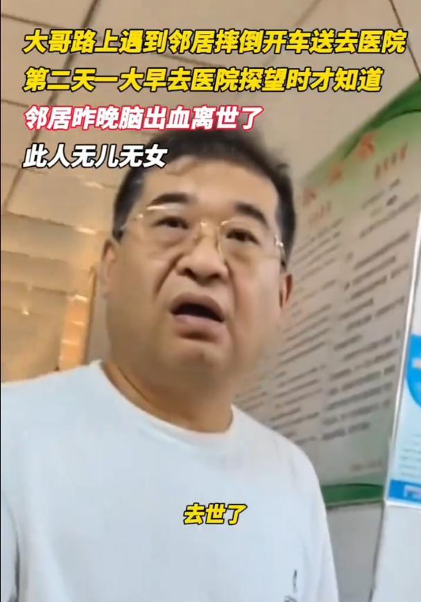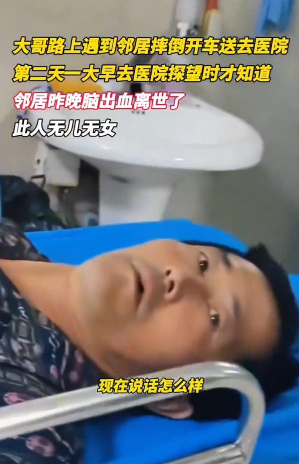 心酸!吉林,男子开车在路上看到邻居摔倒在路上,因对方无儿无女,男子就把邻居送到了医院,不料,第二天拎着水果来看望,却被告知邻居大哥前一晚脑出血离世了。网友:有时候就是这么突然 前一天开车回家时,男子就看到有个人坐在地上迟迟无法起身,男子一看,这不是小区的邻居大哥嘛,因为他无儿无女,而且还有些囤积症,所以男子一眼就认出来了 连忙下车询问情况,见大哥的状态不是很好,男子就把大哥扶上车,送到了医院,但他也没想到,事情的发展会这么突然,第二天一大早想着来看望,却被告知人已经走了,男子当场表情就变得难看起来 说实话,这种突如其来的消息让人心里堵得慌。很多人习惯觉得老人能挺就挺,病得严重了再说,但有些事根本没有缓冲的余地 那个男子的举动虽然没能挽回结局,但至少在最后一段路上,这位老人不是孤零零倒在街头,而是有人拉了他一把 不得不感叹,有时候一个转身,就是永别,人生无常,明天和意外,谁也不知道哪个先来。我们能做的,就是珍惜眼前人