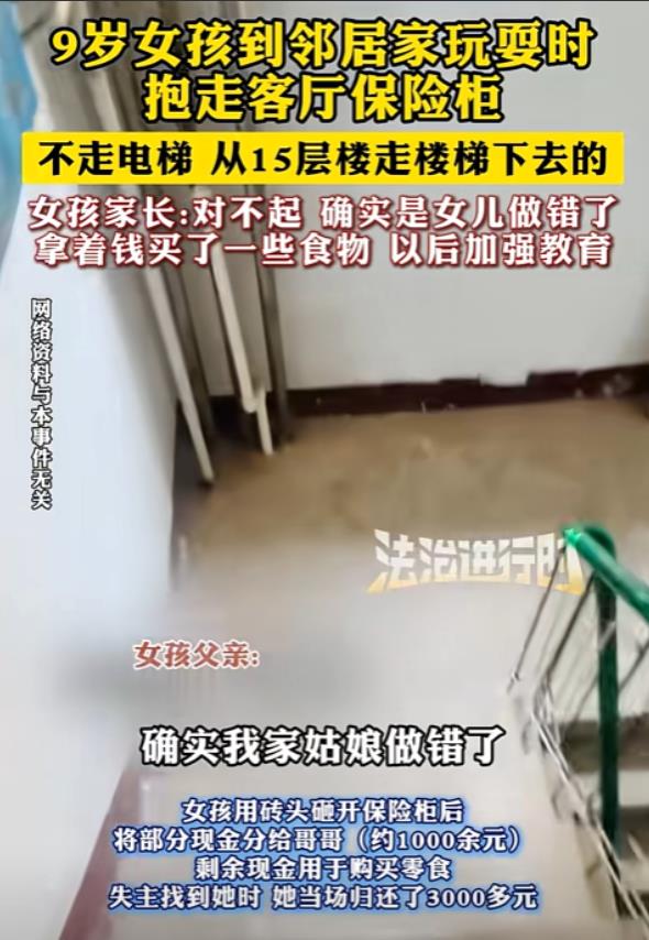 “解释不清了!”郑州,9岁女孩到邻居家玩,竟然偷偷抱走客厅保险柜,不走电梯,从15层楼走楼梯下去,将保险柜砸开之后,把钱分给哥哥,剩余的钱拿去买零食。失主调取监控才发现此事,保险柜里有2万现金和3张欠条。女孩家长:对不起,确实是女儿做错了,拿着钱买了一些食物,以后加强教育!网友:这个女孩长大之后应该不是凡人。