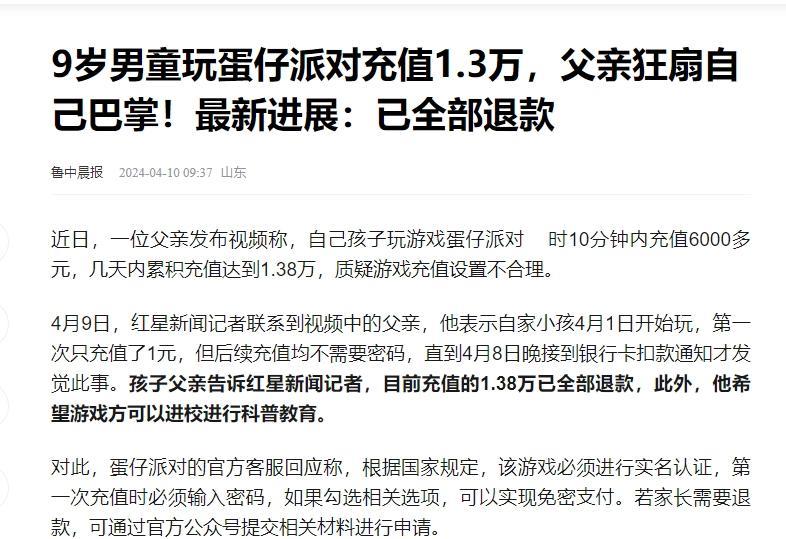 全额退款了!浙江杭州,一9岁孩子玩蛋仔派对10分钟充值6000多元,当父亲发现时,银行卡里的钱已经扣了13824元。花了这么多钱充游戏,当时孩子的爸爸就懵了 想象一下,你正刷着银行流水,突然发现卡里一万多块钱没了,全转给了游戏公司,这事发生在杭州一个普通爸爸身上,他的9岁儿子就玩了10分钟蛋仔派对,结果扣了这么多,到底咋回事? 这个事件起于周末,小明用父亲手机玩蛋仔派对,短短10分钟内充值6000多,总扣13824元。游戏机制允许一次充值后无限免密支付,孩子点盲盒皮肤68元起,快速累积大额。父亲陈先生查看银行卡时,发现钱没了,一笔笔转给网易雷火科技。类似西安鲁先生家,孩子从2月12日开始充值,单日3000多,总9000多,家长取款时才知。 网易方说,二次充值不退,因协议约定只处理一次,账号永久封存,但律师指这无效。赵良善分析,《民法典》第497条规定,格式条款加重消费者责任无效,排除对方权利也无效。未成年充值无效,公司须退全,不受次数影响。杭州案例中,陈先生儿子用华为渠道账号,免密支付顺畅,孩子没自控力,沉迷买皮肤。网上投诉多,黑猫平台有家长说孩子用奶奶号充2000多,申请退款难。消费保记录,1月25日至3月6日,女儿充751元,退款投诉网易。 金融证券报道,小学生充数千,网易没明确退款标准,还讨价还价。腾讯新闻4月12日文,父亲视频称儿子10分钟充6400,几天一两万,免密支付成坑。江西网5月29日,游戏让未成年轻松充值,应全额退。华龙网12月6日,百余家长投诉,孩子沉迷,充值超400万,实名漏洞大。时代在线12月9日,网易上线一键禁止充值,已超800万家长用,全渠道人脸识别,但争议仍存。知乎专栏分享退款方法,家长维权后退80%,国庆期间答应快。 抖音搜索网易退费成功案例,多杭州张先生带孩子去网易门口,自扇耳光,称子不教父之过,后全额退。青年网8月22日,家长与蛋仔“战争”,律师说用孩子身份充值可退全,但用成人账号难。封面新闻5月21日,退款过“六大难关”:证明孩子操作、渠道区分、协议限制等。蛋仔派对2023年升级防沉迷,理性消费倡议,每日充值限328元,周限1288,但落实不严。 杭州吴女士12岁女儿三个月充8000,运营商退款难。潮新闻4月19日,身份查验松,孩子易绕过。蛋仔信中坦诚,遇特殊案例如租售账号,处理复杂。2025年3月,中新网报道,蛋仔与公安合作,反诈动画播放破千万。直播充值禁止未成年,但游戏仍问题多。事件核心,孩子充值无效,家长需证据,公司应退全,但实际维权耗时。陈先生发现后,懵了,钱本用于家庭,暴露游戏设计坑低龄儿童。 事件曝光后,陈先生去网易大楼讨说法,自扇十几耳光,视频狂传,小明几天没上课。媒体介入,网易核实华为渠道账号,与华为协调,全额退13824元。类似丽水叶先生,全额退后维权群活跃。网易回应,升级防沉迷,全平台退款入口,一键禁止功能。2023年12月,累计退3万单,但家长投诉仍多。 上海市消保委“三问”后,网易发灵魂三问:渠道服傻傻分不清,退款出“教程”。9月23日长江日报,家长为孩子充值退款纠结渠道。2024年5月13日搜狐,多家长起诉,管辖约定移送,游戏公司责任减轻质疑。2024年5月20日封面,退款难关多,一年七八百家长进群。2025年7月15日黑猫,小朋友充2000多,家长揍后求退。2025年3月19日消费保,女儿充751,投诉网易。 抖音7月12日,诈骗案例钱难退,但杭州张先生全额退。网易云游戏1月25日,退款教程:登录官网,找记录提交。超好玩10月9日,退款步骤:联系客服,提供证明。蛋仔官网11月2日,家长指南:防沉迷举措,人脸识别全接入。2023年12月8日时代周刊,继续升级,严防冒用账号。2025年中新网,公益创新,反诈教育。 事件结局好,但侧面显游戏问题,孩子扣款事件频发,反馈渠道不明,吃亏家长多。蛋仔受欢迎,但氪金无底线,盲盒坑小学生。希望家长及时联系游戏方,挽回损失。类似鲁先生,二次不退无效,律师建议走法律。陈先生退款后,儿子返校,公司按规处理,强调家长监督密码。整体看,未保需多方努力,公司别推责,家长多警惕。 这事闹大后全额退了,你家孩子玩蛋仔派对有类似充值问题吗?退款顺利不?欢迎评论区分享经验,一起讨论怎么防这种坑!