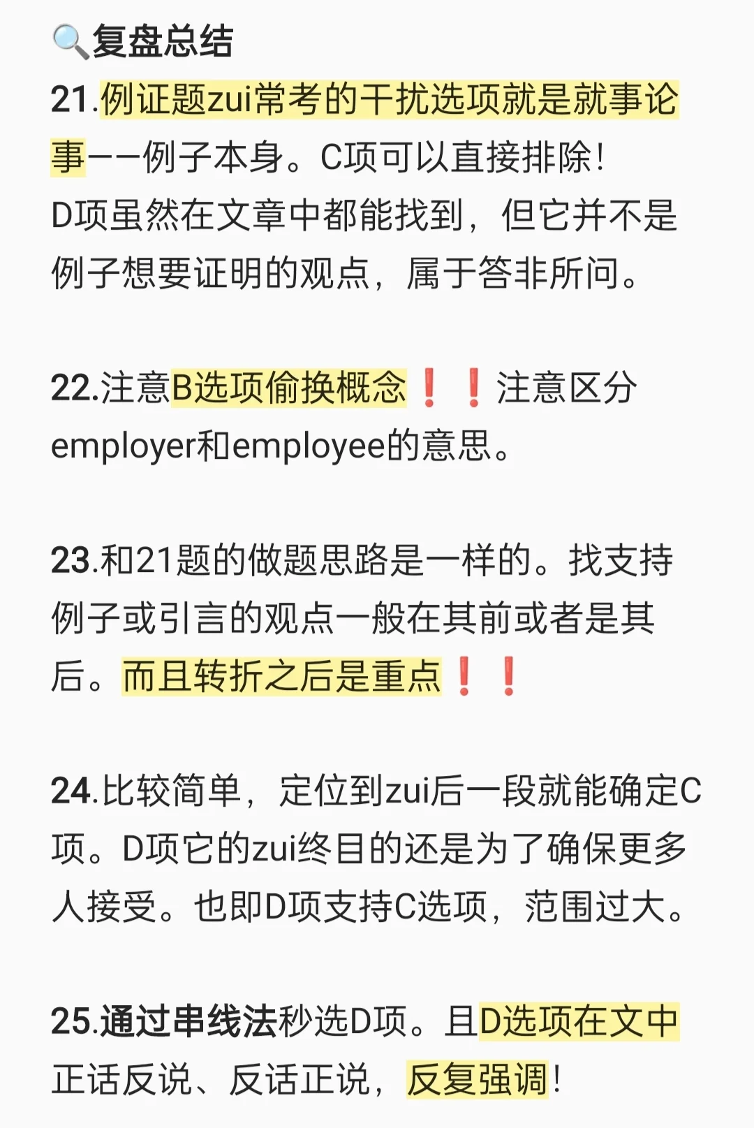 23.和21题的做题思路是一样的。找支持例子或引言的观点一般在其前或者是其后。而且转折之后是重点❗❗