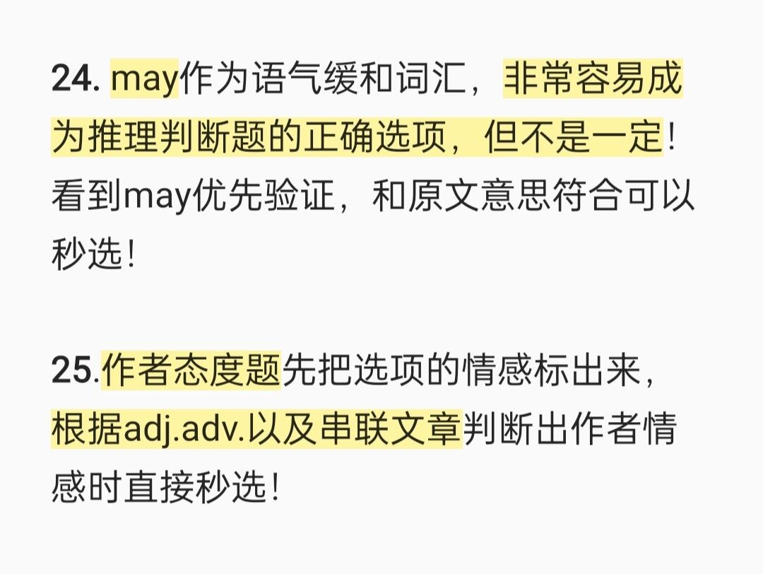 24. may作为语气缓和词汇,非常容易成为推理判断题的正确选项,但不是一定!看到may优先验证,和原文意思符合可以秒选!