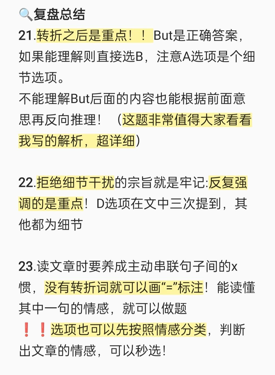 23.读文章时要养成主动串联句子间的x惯,没有转折词就可以画“=”标注!能读懂其中一句的情感,就可以做题