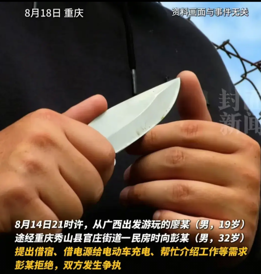 持刀杀人的男子很年轻,只有19岁,名叫廖某,原本是广西的。他骑电动车从老家出发一路游玩,到达重庆秀山彭大哥的住处时,是8月14日晚上9点多。