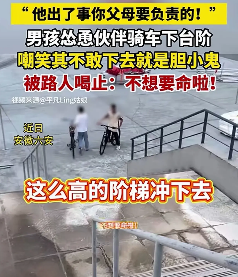 安徽六安体育馆附近,两个十来岁的男孩在台阶边玩自行车,那台阶又陡又长,看着就让人心慌。其中一个男孩二话不说,骑着车就冲了下去,速度越来越快,好在最后晃着车把稳住了。他回头一脸得意,冲着台阶顶上的同伴喊:“你不敢吧?胆小鬼!”