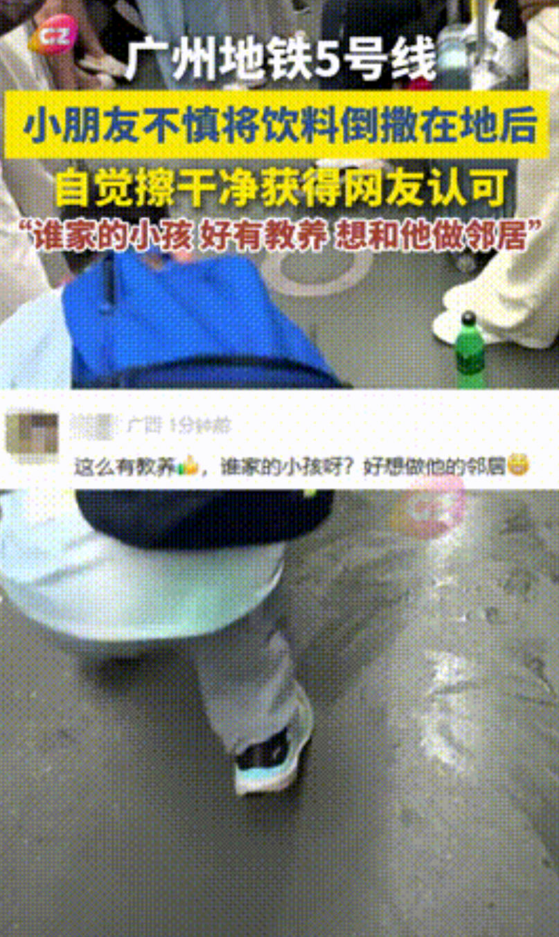“给大人上了一课!”广东广州,一小男孩乘坐地铁期间,手上的饮料不慎洒在了地面上,可没想得到的是,他随后的做法,让不少大人都感到自愧不如!网友:这就是家庭教育的榜样,孩子长大的人品也不会差的! 8月15日,广州地铁的一节车厢里,挤满了行色匆匆的乘客,其中就有着一个小男孩,他的手上捧着一杯饮料。 因为是站着乘车,再加上车子启动时的摇晃,小男孩差点倒在地上,手里的饮料突然滑落,里面的甜水也瞬间在地板上扩散开来,要知道这种液体是最不好清理的。 看到这一幕,大家都以为这孩子会选择无视离开现场,谁料他却蹲下去用纸擦拭,而且擦得特别仔细,连地板接缝处的污渍都没放过,最后还专门把废纸垃圾放在垃圾桶。 这事儿在网上传开后,网友们纷纷表示这孩子太懂事了,家教肯定好,也有人感慨,现在很多家长只关心孩子考试分数,却忘了教这些做人的基本道理。 这个擦地板的小男孩,肯定不是第一次这么做,说明家长早就培养了他的责任意识,如果每个人都能像那个小男孩一样,主动维护公共环境,我们的生活空间会美好很多。 大家聊聊,你有没有想起自己曾经在公共场合做过的一件暖心小事?或者有没有遇到过让你特别感动的文明行为?