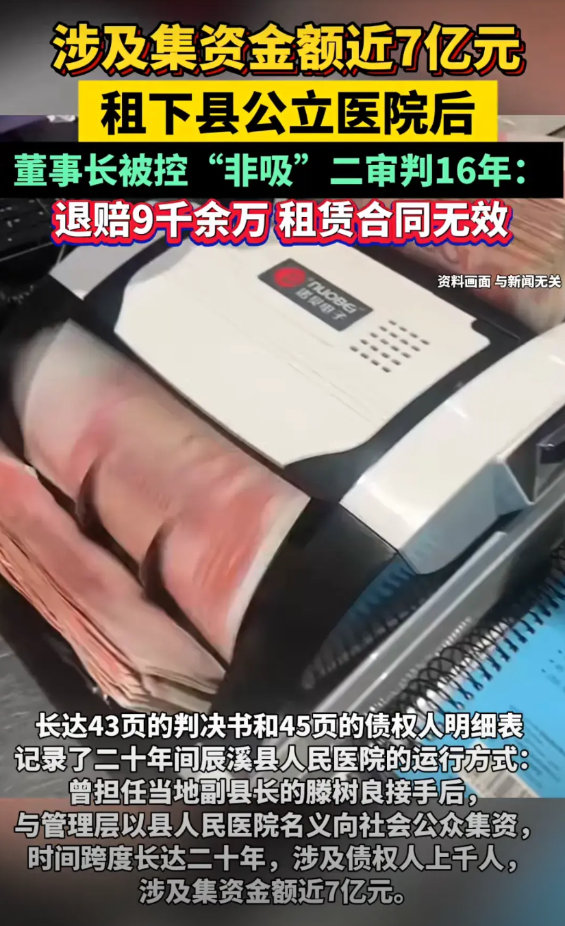 湖南辰溪县原副县长滕树良以租赁县人民医院名义,20年间非法集资近7亿元,涉及上千债权人。 二审维持16年刑期,退赔额从7047万增至9335万,并认定医院租赁合同因违规出借医疗资质无效,属变相经营非营利机构。