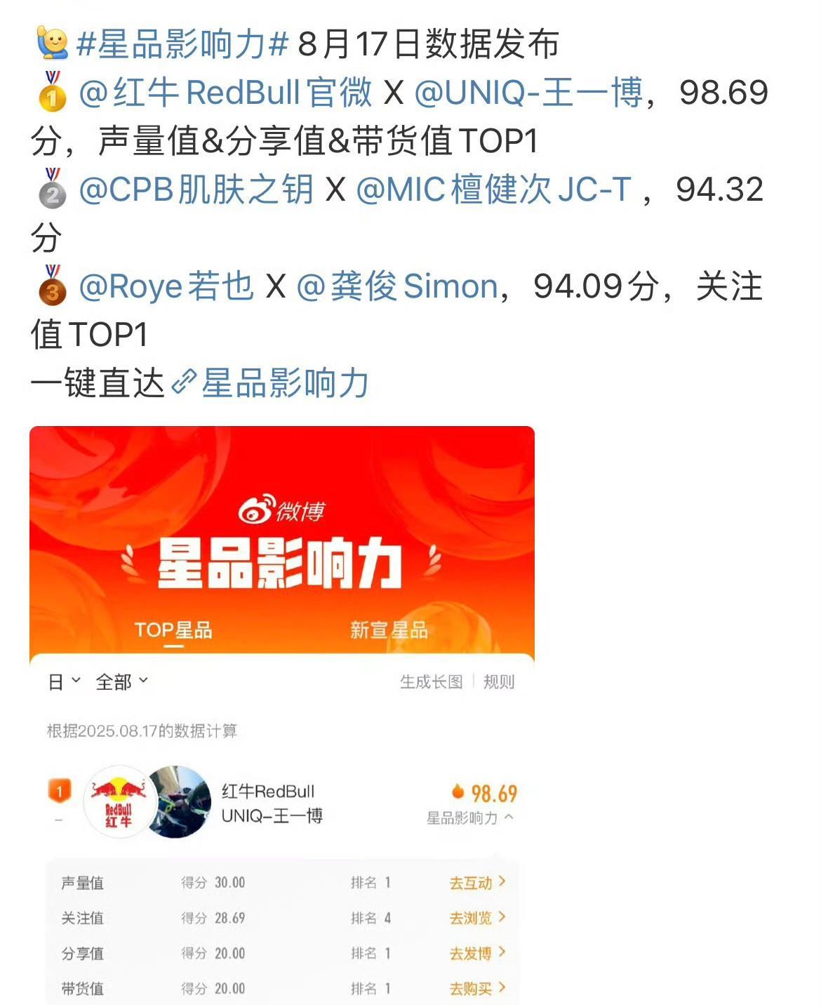 #王一博# 8.17星品影响力第一,两个代言上榜。 拿下一周互动最高代言。