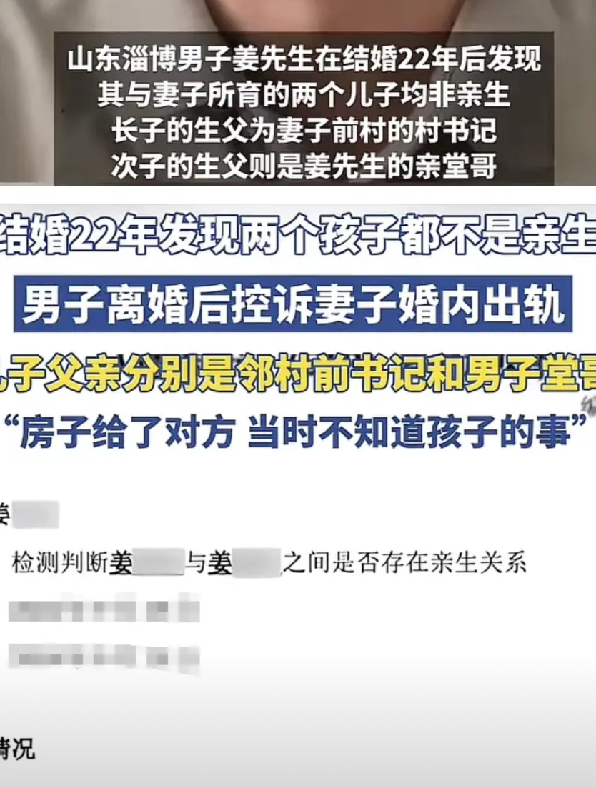 山东,一男子发现结婚22年的妻子出 轨,便与她离婚,为了孩子更好的生活,仅留下一辆车,剩下的全给了妻子和儿子。岂料,大儿子上门争财产,还动手打男子。令男子崩溃的是,他去做亲子鉴定,竟发现两个儿子都不是亲生的,大儿子是村书记的,二儿子竟是男子亲堂哥的! “我怕你们过不好,离婚了我还想着多给你们点钱!谁知道俩儿子竟然一个都不是我的!”姜先生(化名)在得知真相后,十分崩溃,他怎么都想不到和自己生活了22年的妻子竟然做出如此不堪的事情! 8月13日,大象新闻报道了一则离谱的的婚姻欺诈案。 2002年12月,姜先生迎来他一生中最幸福的时刻,他和妻子走向婚姻的殿堂。为了赚钱养家,姜先生在朋友的带领下跑到外地打工,每天除了吃饭,剩下的钱全给妻子寄回家。因为工作原因,姜先生一年到头回不了几次家,但每次回去夫妻俩人都很恩爱甜蜜。 2004年,妻子为他生下了一个儿子,儿子可爱聪明,让姜先生充满了干劲,一家三口日子过得挺幸福。 2014年,妻子再次怀孕,生下来的还是儿子,孩子多了以后,家里的压力突然变大,姜先生更加卖命的在外打工,一心想给老婆孩子更好的生活条件。 这些年来姜先生赚的钱,给家里盖了新房子,还添了不少家电,妻子带着孩子生活的非常滋润,村里人都很羡慕。 直到2022年,姜先生发现他给妻子聊天妻子经常不回复,就算回复了也很敷衍,和之前的语气大不相同。询问儿子后,她才知道妻子还经常夜不归宿,不知道去干嘛了。 他十分生气,自己一心在外面赚钱养家,为的就是一家人过上好日子,可没想到自己疏忽了妻子,让她有了其他的想法。回到家后,俩人因为不信任经常吵架,吵得不可开交。两人因此感情彻底破裂,选择离婚。 离婚过程中,姜先生把财产让给了妻子和两个儿子,毕竟儿子没做错什么。妻子这些年聚少离多的也辛苦了,自己仅仅留了名下的一辆车。可离婚后,大儿子的态度让姜先生心寒。 大儿子觉得姜先生父母名下的那套房子也是花钱买的,大儿子觉得也应该属于他们,于是上门问姜先生索取,遭到拒绝后,儿子竟然对自己父亲动手! 姜先生晚上在床上辗转反侧,就是睡不着觉,想想大儿子的行为习惯,长相面貌,和自己一点关系都没有。再加上父母也提过一嘴,大儿子和夫妻俩人长得都不像,这让姜先生起了疑心。 他越想越不对劲,就去做了亲子鉴定,结果显示:两个儿子竟然都不是他亲生的!经过他观察,大儿子竟然是村书记的,而二儿子更让人难以接受,是姜先生堂哥的! 这件事让姜先生直接崩溃,他居然替别人养了二十多年的儿子,亏自己出钱又出力,还想着他们三个。 目前,姜先生认为自己在不知情的情况下被欺骗,导致自己在离婚财产分割上做出让步,已经将前妻告上法院。要求重新分割财产,并且追讨精神损失费,案件已经进入法律程序。 对此你怎么看?欢迎大家在评论区留言讨论。