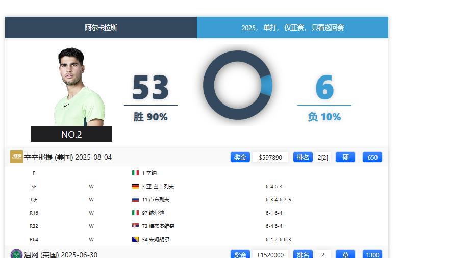 辛纳今年禁赛几个月,截止到目前取得31胜3负,辛辛那提决赛对阵世界第二阿尔卡拉斯