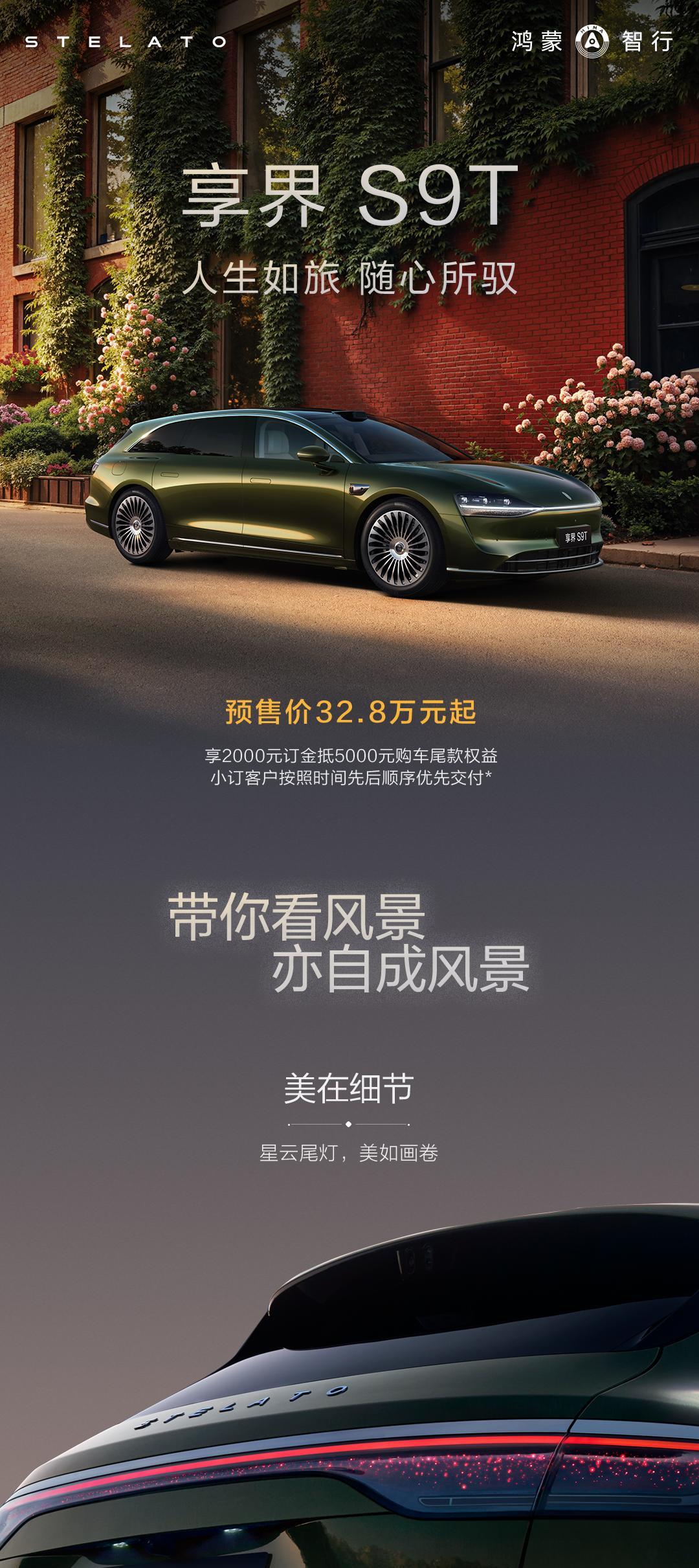 享界S9T预售价:32.8万起,全系标配S800同款ADS4.0高阶4激光雷达,我觉得这个价格非常有诚意!! 还有刚在朋友圈销售看到: 小订2000抵扣5000尾款。 送价值10000的仙棕绿,价值10000寰宇红颜色。 原价值6000星辉轮毂免费送。