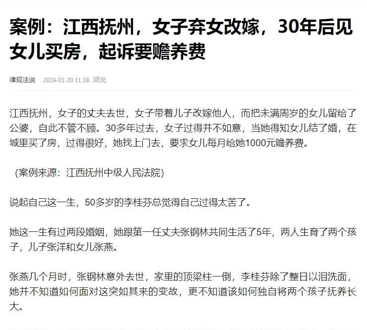 江西抚州,女子丈夫去世后,把未满周岁的女儿留给公婆,她却带着儿子嫁人。年幼的女孩被伯父伯母养大成人。30年后,女人得知女儿结婚买房后,怒冲冲找上门去,要求女儿每月给1000元赡养费。被拒后把女儿告上法庭,法院这样判了! 在江西抚州这个地方,有个女人丈夫突然没了,她就把刚满一岁的闺女扔给公婆,自己抱起儿子就改嫁了。小丫头片子后来靠伯父伯母拉扯大,长成大人了。过了三十年,这女人听说闺女结了婚,还在城里买了房,就气呼呼跑来要钱,每月一千块赡养费。闺女不给,她直接告到法院去。法院最后咋判的?往下看,你准会觉得这事太扎心了。 这个故事发生在江西抚州农村,牵扯到家庭责任和法律底线。李小菲小时候家里还算过得去,她爸是村里典型劳力,白天在地里干活,闲时出去打工挣点外快。周梅就是她妈,那时候在家带两个孩子,儿子大点,闺女刚会爬。日子虽苦,但一家子凑合着过,村里人看着也觉得稳当。可她爸一出事,车祸没了,整个家就散了架。 周梅没扛住,哭了几天,就听娘家劝,觉得还年轻,不能守寡苦一辈子。她一合计,儿子好带点,闺女太小费劲,就直接抱儿子走了,三个月后找了个男人再婚。李小菲就这么留在了公婆家,奶奶当时气得晕过去,伯父伯母赶紧送医,家里乱套一阵子后,才想起来小丫头还搁那儿没人管。从那起,伯父伯母就把她当自家孩子养,比对亲儿子还用心,花钱供她上学,啥好吃的都先给她。李小菲长大后考上卫校,毕业进医院工作,找了个对象,2018年结婚,伯父伯母连彩礼都不收,就盼着小两口过好日子。夫妻俩努力,在南昌买了房,李小菲也没忘恩,常给伯父伯母买东西寄钱。村里人都说,这丫头知恩图报,老人没白养。 三十年过去,周梅那边日子不好过。她生李小菲后做了结扎,二婚没再生孩子,丈夫对她不待见,家境也穷。2021年,她听说闺女买房了,就上门先要彩礼钱,被伯母赶出去。她不死心,直接起诉,要求每月一千块赡养费,说自己身体差,没收入,低保户每月就五百多块,闺女得尽义务。李小菲在法院里反驳,说当年妈抛弃她,构成遗弃,现在没资格要钱,还说周梅才五十多岁,能干活。 法院审了审,认周梅有困难,但她有两个孩子,负担不能全推李小菲头上,加上她当年没尽抚养义务,有过错,就判李小菲每月给三百块。周梅不服,上诉,二审维持原判。这事闹出来,反映出农村家庭常见问题,很多父母年轻时不管孩子,老了就想靠上,法律虽说赡养是义务,但也得看实际情况。周梅这种行为,搁谁身上都觉得凉薄,她没养过一天,就想拿钱,法院判得轻重合适,提醒大家权利义务对等。 类似事在江西其他地方也发生过,比如有个叫陈佳欣的女孩,十七岁就经人介绍结婚,丈夫叫吴建兵,两人感情不错,很快就生了闺女小朦。日子甜蜜没多久,2019年丈夫车祸没了,陈佳欣十九岁守寡,带着五个月孩子回婆家。可婆婆重男轻女,看不上闺女,还造谣孩子不是亲生的,拿到赔偿款后就把她们娘俩赶出门。 陈佳欣没法子,回娘家,父母劝她扔孩子再嫁,她不肯,就自己出去送外卖,风里雨里挣钱养娃。几年下来,她在清明节带孩子祭拜丈夫,发视频说要带着血脉往前走。这故事和李小菲的有点像,都是丈夫没了,女人面对家庭压力,但陈佳欣选择扛起责任,周梅却扔下孩子不管。现实中,这样的案例不少,法院常遇到赡养纠纷,法律规定成年子女得赡养父母,但如果父母遗弃过,法院会酌情减免。江西抚州中院这个判例,就体现了公平原则,周梅虽穷,但她行为导致母女关系断裂,李小菲给三百块已是底线。 农村重男轻女思想根深蒂固,周梅带儿子走扔闺女,就是典型例子。她再婚后日子苦,可能是报应,但法律不讲报应,只看事实。法院引用民法典和老年人权益保障法,说赡养不能以任何理由拒绝,但也得考虑父母过错。周梅低保五百多,还不算完全无能力,她儿子也该分担,可她只告闺女,明显偏心。 这样的案子,社会影响大,提醒年轻人结婚生子得想长远,别一时冲动扔下责任。伯父伯母养李小菲三十年,没血缘却尽心尽力,这份恩情比亲妈大多了。李小菲工作稳定,买房结婚,靠自己努力,也没怨恨过去。周梅上门要钱时,被拒后直接打官司,过程闹腾,但法院判得公道,没全支持她。李小菲每月三百块,算下来一年三千多,对她负担不大,对周梅也是点帮助。但关系修复难,周梅败诉后,估计日子还得自己过。 更多类似事在网上流传,江西其他县也有父母告子女赡养,法院酌情判。原则是子女义务不能免,但父母过错减免。周梅案子典型,体现了这个。陈佳欣没告人,但她的坚强感染人。家庭纠纷,得从根源解决,重男轻女得改,父母责任得尽。社会进步,法律跟上,这样的故事会少些。 这个故事看完,你有啥感想?是觉得周梅太自私,还是法院判得对?欢迎在评论区分享你的看法,大家一起聊聊家庭责任这事儿。
