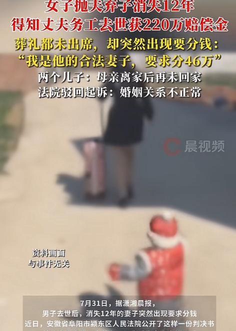 “太不要脸!”安徽,一女子抛弃5岁和7岁的儿子离家出走,再也没回过家,丈夫独自拉扯2个孩子。12年后,丈夫打工时意外去世,单位赔偿了220万,岂料,女子却突然出现,竟要从孩子手里分46万赔偿金!孩子怒斥:你连葬礼都没参加,没资格分!法院这样判! 院门外的寒风裹着雪粒子,打在贺美琴脸上,可她仿佛没知觉,只是盯着院子里烧纸钱的两个年轻人,声音像结了冰:“我是你爸合法妻子,这钱必须有我的份。” 大儿子猛地站起来,手里的火钳“哐当”砸在地上,火星溅起又落下,像他心里烧了12年的火气:“妻子?你走的那天,我刚掉了第一颗乳牙,小宇还在哭着要喝奶粉,你回头看过一眼吗?” 这话像根针,刺破了贺美琴脸上的强硬。她往后缩了半步,却仍梗着脖子:“我当年是有难处……”“难处就是12年不打一个电话?难处就是我爸摔断腿躺床上,你连条短信都没有?” 小儿子接了话,声音发颤,却比哥哥更直接。 兄弟俩的质问里,藏着的是2011年那个春天的记忆——那晚父母吵架的声音掀翻了屋顶,母亲拖着行李箱出门时,鞋跟敲在水泥地上的声音,像在数着这个家散架的倒计时。 父亲追出去的身影消失在巷口,回来时攥着母亲落下的围巾,蹲在地上,半天说不出话,最后只对他们说:“妈去赚大钱了,以后给你们买大房子。” 那“大房子”成了父亲程强12年的执念。他是个泥瓦匠,没读过多少书,却把“赚钱养家”四个字刻进了骨头里。 每天天不亮,他就骑着那辆除了铃铛不响哪儿都响的二手摩托去县城工地,中午啃两个冷馒头,晚上回来,不管多累,都要给两个儿子洗手、做饭、检查作业。 大儿子记得,自己10岁那年冬天发烧到40度,父亲背着他走三里地去卫生院,雪没到膝盖,父亲摔了三跤,每次都先把他往怀里搂,自己后背结了层冰,却一个劲问“冷不冷”。 小儿子上四年级时想要个遥控飞机,父亲连着三个周末没休息,在工地帮人搬钢筋,手指被轧出紫血泡,拿到工资的那天,举着飞机冲进家门时,笑得像个孩子。 12年里,程强的衣服永远是工地发的工装,洗得发白起球,却把兄弟俩的校服熨得平平整整;他自己顿顿咸菜配米饭,却每天变着法给孩子做鸡蛋羹、炖排骨。 大儿子考上重点高中那天,他翻出压在箱底的旧相册,指着贺美琴的照片,跟两个儿子说:“看,你妈年轻时可俊了,她要是知道你们这么出息,肯定高兴。” 那时兄弟俩没说话,心里却都清楚,父亲手机通讯录里,“孩子妈”三个字后面,从来没存过号码。 2022年12月的那个清晨,程强在工地脚手架上踩空,摔下去的时候,手里还攥着给小儿子买的练习册。 施工方赔偿的220万里,3万用来办了葬礼,19万给了年迈的爷爷奶奶,剩下的198万,兄弟俩计划着存起来,一部分给老人养老,一部分当学费。 他们以为,日子终于能喘口气,却没想到,消失12年的母亲会突然带着一张泛黄的结婚证找上门。 贺美琴说自己在外地开服装店,刚听说程强去世的消息,可村委会的证明上写得明明白白:“2011年至今,贺美琴未回村,未对子女履行抚养义务,未探望老人。” 大儿子翻出父亲的旧手机,通话记录、短信箱,干干净净,没有任何来自贺美琴的痕迹。 “我爸走的那天,殡仪馆的人问要不要通知家属,爷爷说‘不用了,她早不是这个家的人了’,你现在来要什么钱?” 贺美琴没辙,把两个儿子告到了法院,律师在法庭上说:“《民法典》规定,配偶是第一顺序继承人,我当事人有权分割赔偿金。” 法官却指着卷宗里的证据问贺美琴:“这12年,你给孩子买过一件衣服吗?给程强打过一次电话吗?他住院的时候,你在哪?”贺美琴低下头,说不出话。 法官最后宣判:“死亡赔偿金虽参照遗产处理,但权利与义务对等。贺美琴12年遗弃家庭,未尽任何义务,无权分割。” 判决下来那天,兄弟俩去给父亲上坟,把判决书烧了。大儿子对着墓碑说:“爸,你看,法律是公道的。”风卷起纸灰,飘向远处的田野,像父亲轻轻的叹息。 后来,他们用那笔钱给爷爷奶奶的老屋换了新窗户,装了暖气,剩下的钱存进了银行。小儿子说:“等哥考上大学,我就去学汽修,以后靠自己,就像爸教我们的那样。” 阳光透过窗户照进屋里,落在兄弟俩的课本上,上面有程强以前写的批注:“好好读书,做人要本分。” 或许贺美琴到最后都没明白,她丢掉的从来不是220万,而是一个母亲、一个妻子最该有的本分——责任这东西,丢了就捡不回来了,就像法律不会偏袒一个只想要好处,却不肯付出的人。 信息来源: 闽南网|男子去世消失12年妻子出现要分钱,起诉要求分46万死亡赔偿金,法院判了!