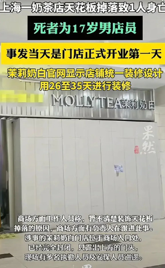 近日,山海一家奶茶店发生意外事件,店里的吊顶突然脱落,砸下店内正在工作的员工,造成一人不幸去世,据知情人士称,去世的人是一个未满十八岁的小伙子,是来店里做暑假工的。