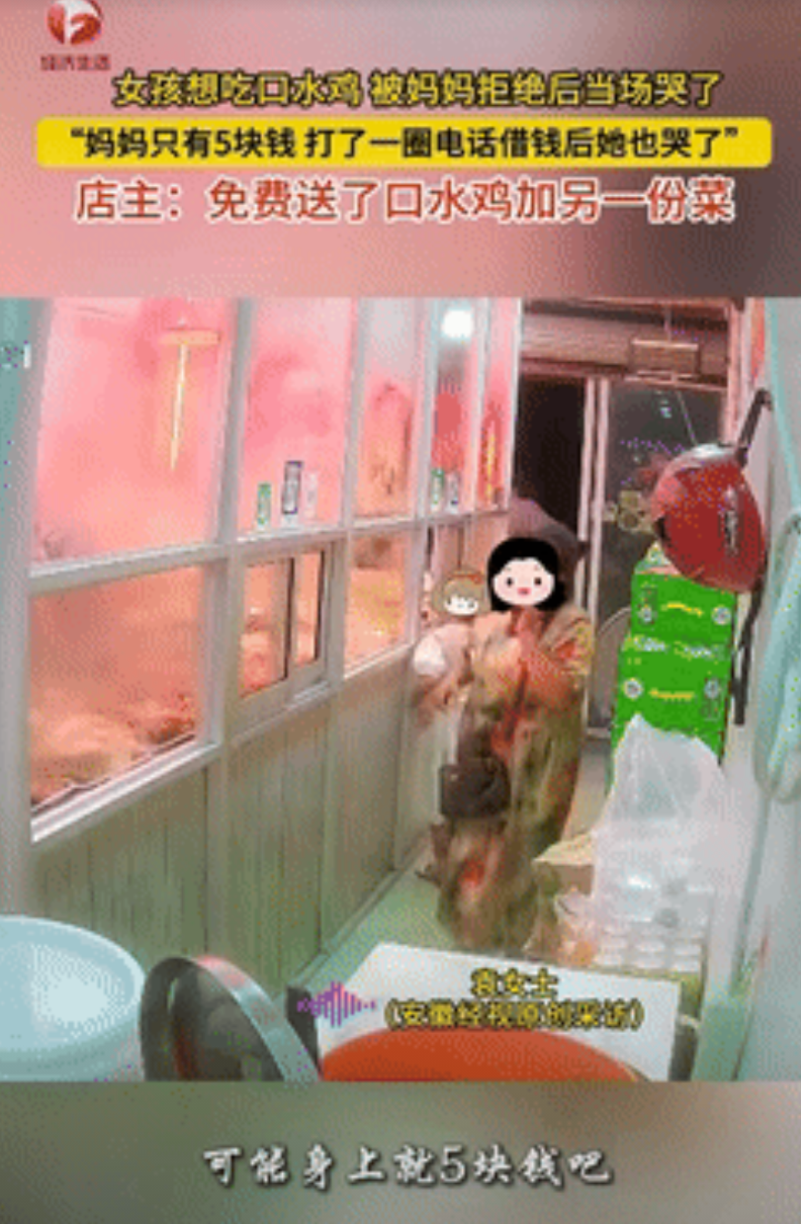 江苏南通,女子拿着5块钱来买菜,不料孩子非要吃18块的口水鸡,可女子打了电话借了一圈也没借到钱,母女两人都忍不住哭了起来,老板看着心酸,就免费送了她们一份,事后有人觉得不可思议,网友:站着说服不腰疼,有的人真的很难! 事情发生在8月15日,一位小女孩跑进熟食店中想要吃口水鸡,后面进来的女子身上只有五块钱现金,根本不足以购买18元一份的口水。于是女子打了十几分钟电话,竟然连18元都未借出来! 原来女子的丈夫是一名酒鬼,每天无所事事就是在家里面喝酒。只有女子在家中偶尔打一些零工赚钱,这也仅仅只能维持简单的温饱。有时候丈夫还会问女子要钱买酒,没钱时丈夫就会找亲戚朋友们借钱,这么多年她不敢见亲戚朋友就怕要钱还不起, 虽然母女俩的生活过得捉襟见肘,但是女子依旧每天把孩子打扮的干干净净的。就算是邻居的孩子不穿的连衣裙给她,她也会洗的干干净净然后再缝上小花给女儿穿。 事发当天,女子拿着仅剩五元钱准备去菜市场买点青菜当做晚饭。可是带孩子来到菜市场时,孩子被旁边的一家熟食店里飘出来的香味吸引。跑进了人家的店里面,扒着买菜的窗口可怜巴巴的看着。 然后转头对着后面进来的女子说,妈妈我想吃口水鸡。女子问老板多少钱,老板说十八块钱一份。女子劝孩子钱不够,明天再来买,但是孩子直接抱着女子哭起来,非要吃。 没办法,女子拿出皱皱巴巴的五块钱问老板,五块钱能不能少买一点,给孩子尝尝鲜就行。老板看着一时不知道该怎么回答,周围买菜的人也都看着女子指指点点。 一时窘迫的女子拿出手机给亲戚朋友打电话,希望可以借给她15块钱,但是一次次打电话,一次次被拒绝挂断,几分钟后女子竟然崩溃大哭。老板看到这一幕熟练的装了一份口水鸡和一份凉菜交给小女孩,说都不容易请她们吃,女子赶忙道谢。 这一幕被围观的群众录下来发到了网上,网友们看到后纷纷给老板点赞: “听起来觉得不可思议,18块钱都拿不出来,但现实还真的有,日子过到难处,真的是欲哭无泪,出门在外都不容易,能帮就帮一把!” “很多人不理解基层的艰难,这就是现实社会。不幸的家庭,各有各的不幸!” 也有人说:“有钱没钱都不重要,但是孩子这种要东西就撒泼打滚的行为得制止。” 有可能是孩子不懂事,也有可能是因为家境贫寒孩子长这么大真的没有吃过。但是孩子的这个表现确实要适当教育一下,如果孩子养成这个习惯在以后的成长中不好。 其实当今社会大家的生活虽然都好起来但是还是会有一部分人吃饱穿暖都挺困难的。我们可能意识不到,但是遇见这种情况能帮一把还是尽量伸出援手帮帮忙。毕竟赠人玫瑰手有余香。 对于这件事情,你们怎么看?