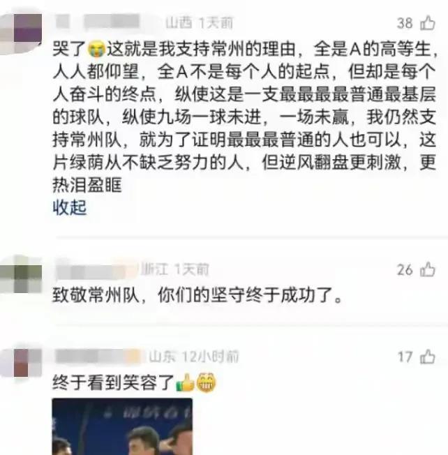 历经九轮煎熬,常州队终于赢球了,书记市长亲临现场送花褒奖,常州市民载歌载舞犹如过年,球员家属更是一片欢腾! 虽然常州队在近百天的时间内一直处于垫底序列,但他们不屈的精神反而激发更多人的“宠爱”,并使他们成为了苏超中一支关注度最高的球队之一。 如今破茧重生,他们终于戳破了胜利的窗户纸,也让我们深刻感受到竞技体育给大家带来的快乐和震撼,这当闻听这些球员家属在分享比赛胜利之时讲,讲出的感人肺腑话语时,小编内心也是非常激动,或许这救赎纯粹的、天然的,没有被污染的体育给我们带来的冲击力。 同时也是为什么一直以来常州队一球未进、一胜难求时,球迷们却是始终不渝,毫无怨言无条件支持的原因所在,因为他与所谓的职业联赛最大区别就是即便是输球,照样还有一股英雄气在纵横驰骋![赞][赞][赞] (最后希望喜欢足球,关注苏超的朋友们去看一下这段视频,估计您也会和我们一样感动的) #万能生活指南#