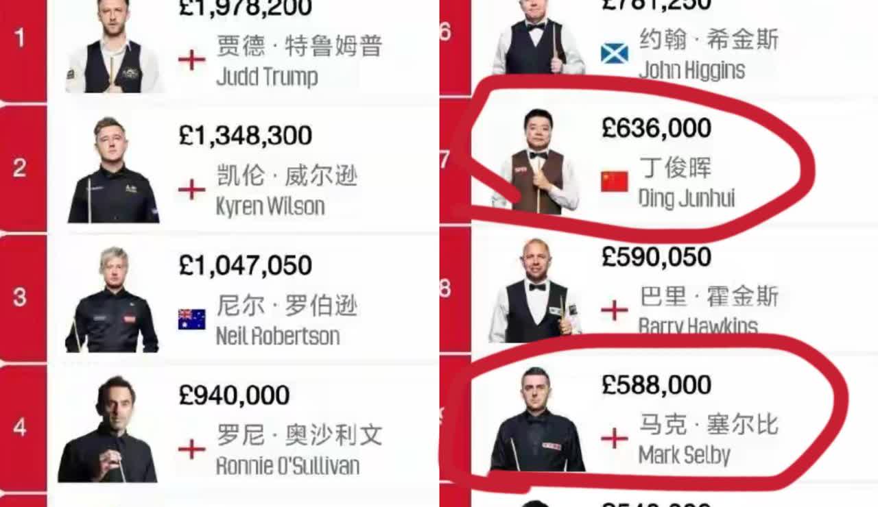 丁俊晖今年面临40万几分的扣除情况,加油吧!目标保持前八