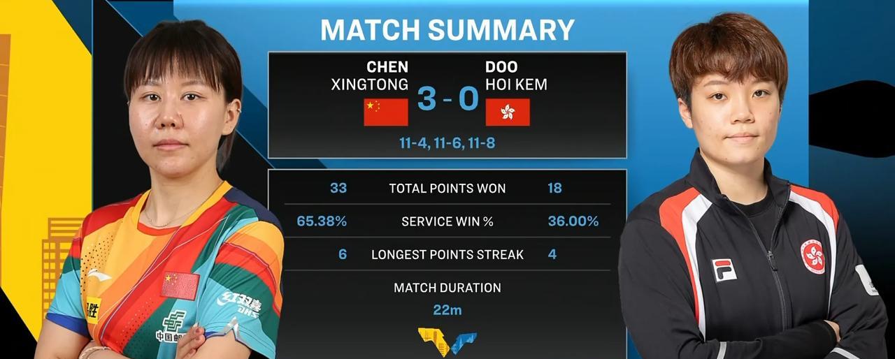 陈幸同横扫杜凯琹,陈垣宇力克亚当·沃林,WTT欧洲大满贯瑞典站丨国乒队员今天上午场比赛最新战报: WTT欧洲大满贯瑞典站丨当地今天上午场北京时间18:35开打,国乒队员进行了两场比赛,国乒名将陈垣宇在先输一局的情况下连扳三局晋级男单32强,下半区陈垣宇与温瑞博承担守区重任。 同时开打的另外一场比赛新科横滨冠军赛女单冠军陈幸同实力占优势,内战港队选手杜凯琹,全场控制了比赛节奏,直落三局结束比赛晋级女单32强! 赛果如下: (1)男单1/32决赛 (2)女单1/32决赛