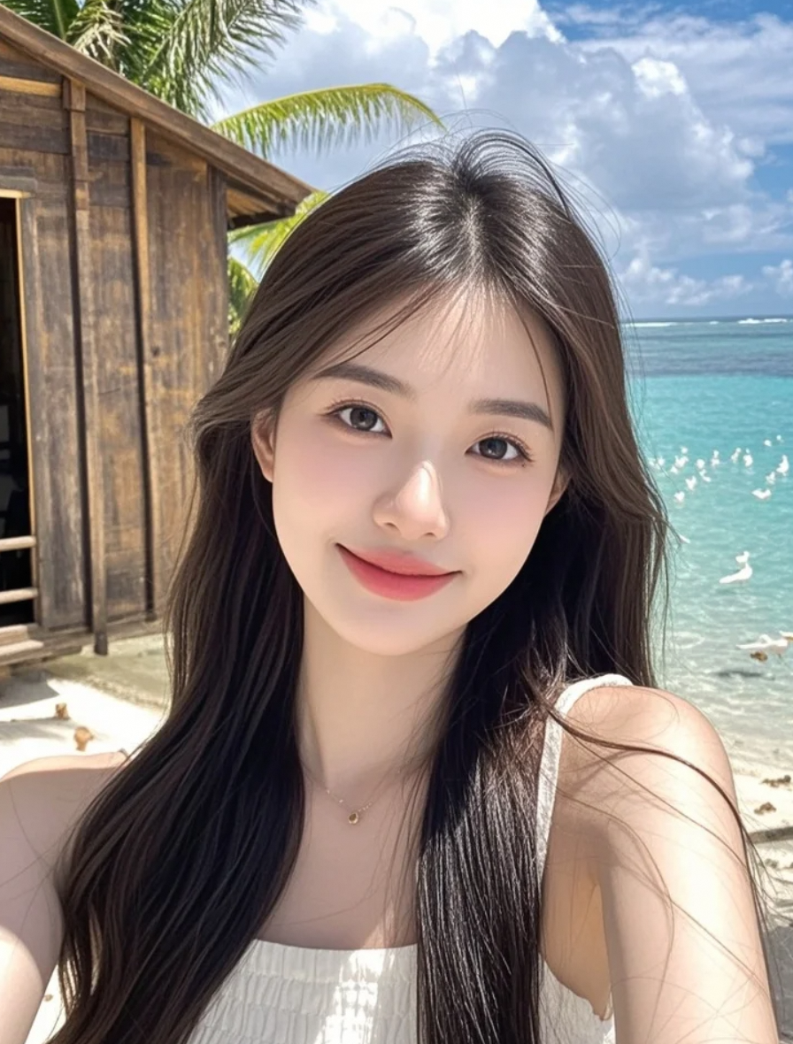 她沉思着看浪花,嘴角扬起浅浅笑意