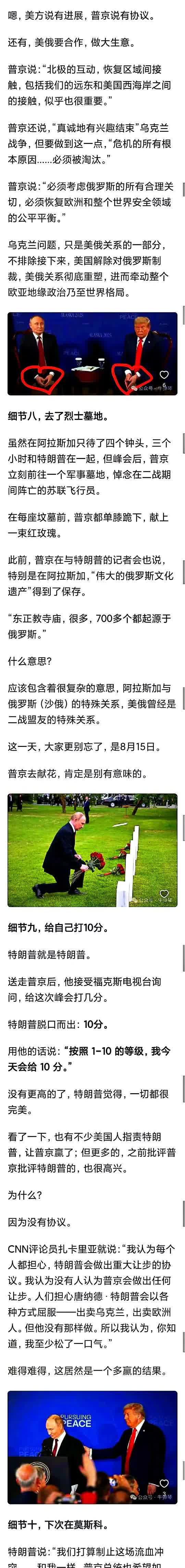 感觉怎么看双普都像前世情人,两个国家对立仇恨到极点,领导人见面居然这么默契、友好、热情,没有一点隔阂,难怪欧洲和乌克兰羡慕嫉妒恨了。 而普京给苏军阵亡军人献花意味深长,是否在暗示:这里曾是俄罗斯的土地,美俄曾经是盟友?会见地阿拉斯加也使人猛然清醒,隔白令海峡相望的两国,离得是那么近,既这样,美俄有什么解决不了的问题呢? 有网友觉得,先是试探,看看能不能靠乌克兰搞垮俄罗斯。三年过后,发现代价太大了,又为了防止东大埋头苦干,暂停一下,看看能不能拉拢俄罗斯一起搞东大? 确实,作为中国人我不希望看到美俄关系缓和,俄不反美我就不挺俄。 对于目瞪口呆的乌克兰,道德上同情和谴责抵消,但还是有点想嘲笑它,纯粹是嘲笑乌克兰过去的天真,以及和它一样真傻或装傻的政客。 我知道嘲笑乌克兰不厚道,但不狠狠嘲笑乌克兰,就会有下一个乌克兰。