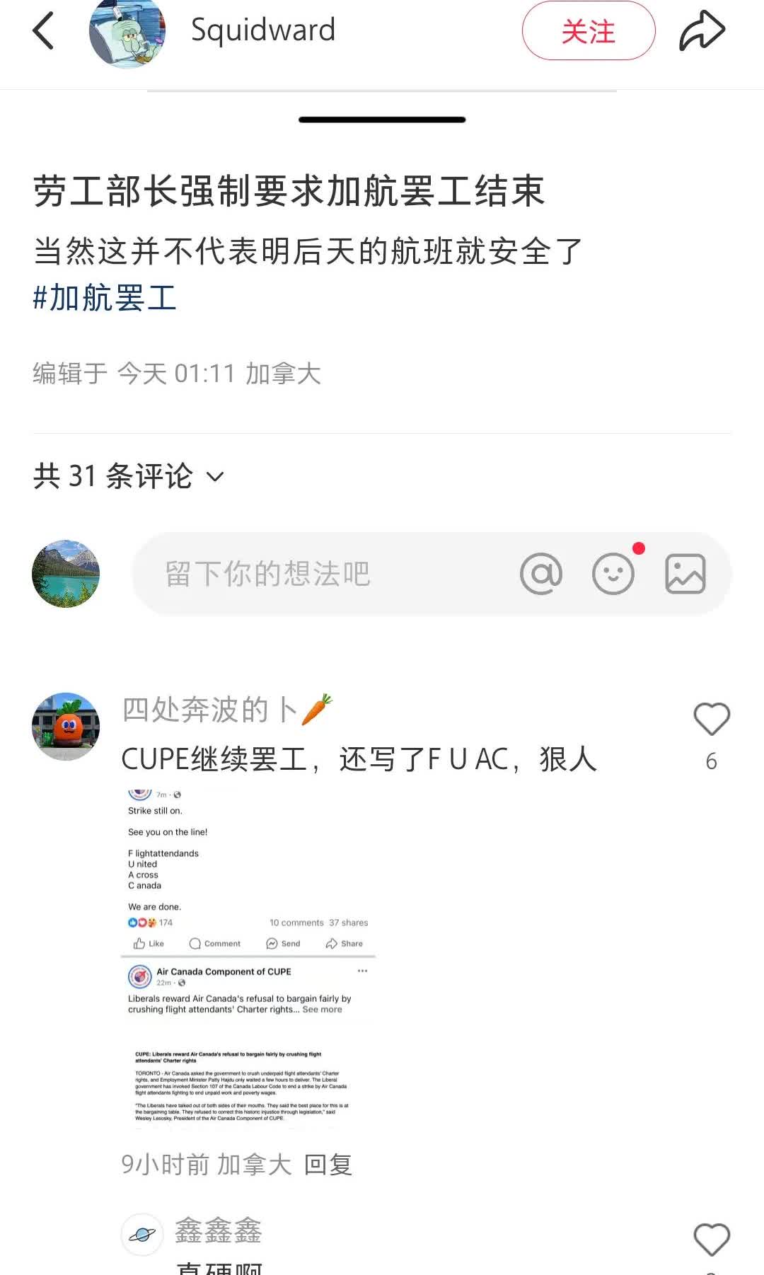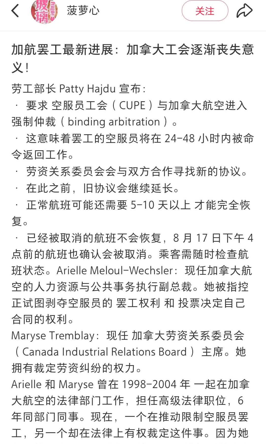 今天在小红书看到的这些。说加航不罢工了,政府强制介入。又有的说航班不一定能马上恢复,工会不一定会执行。 我是希望加航尽快恢复正常。室友20号的AC025航班。后面还有已经买好的国内火车票。如果真的航班取消就麻烦大了。 加拿大政府太无能了。为什么不早一点强制介入?完全不顾及乘客的利益。以后都不买加航的机票了。