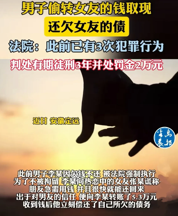 安徽定远,男子欠钱还不上,将面临法律强制执行。他很恐慌怕被拘留,无奈,他向热恋中的女友借钱,谎称是朋友急需用钱,女友转给他5.3万元。男子还了所欠的债务。而后,女友多次催促他都找各种借口拖延。谁知,他竟偷偷通过女朋友的微信向自己转账了5万元,然后把转账记录给删除,转换成现金还给女友,他以为天衣无缝,没用多久他的真实面貌暴露,这下惨了!
