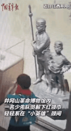 这一幕看哭了多少人!”小学生参观井冈山革命博物馆,其中一名小男孩竟做出一个惊人举动,他默默解下自己的红领巾,绑在了“小英雄”雕塑的脖子上。而旁边孩子受到感染,一起向“小英雄”敬礼鞠躬!网友: 这才是爱国主义教育的成功典范!给几位少先队员小朋友点赞!