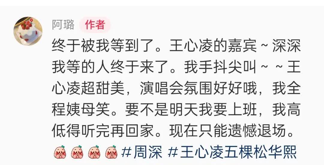 周深比在自己演唱会还紧张! 王心凌:我想要跟你表白一下 ! 周深:啊?嗯?!! 王心凌:在我心中周深一直就是唱商高,EQ高,智慧又高,双押! 而且是非常非常善解人意的人 ,我非常非常非常喜欢 周深! 周深也是真的超真诚的一个人,整个互动一直都在 cue王心凌相关的元素 ! 王心凌:你看他有多贴心,我的新歌他也都会唱,很谢谢你今天来,特别赶来的,他才飞过来然后马上又要飞去其他城市工作了! 周深最后退场的时候还说了一句:那我就先不占用大家时间了,拜拜! 特别忙的周深,台州录制结束就飞北京,然后又飞上海,参加19号W年度光影盛典!