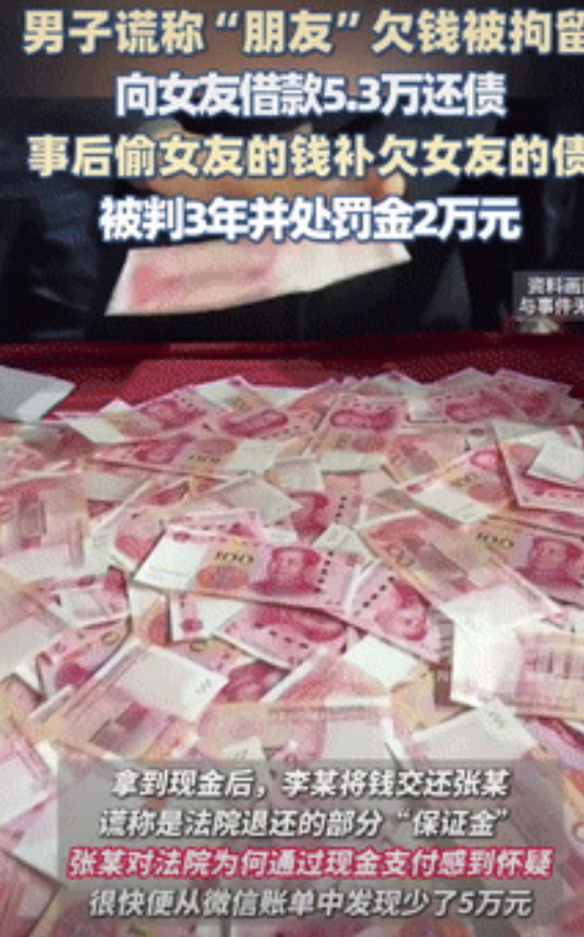 真是个奇葩货!安徽定远,一男子向女友借5.3万元还债,可当女友找来要钱时,男子却因没钱而百般推脱,眼看女友催的越来越紧,男子竟想到偷女友的钱,用来还给女友,事发后,女子立即选择报警,而男子落得个这样的下场! 据大象新闻8月17日的报道,事情的起因,就是男子欠别的钱不还,对方向法院申请强制执行,要是再不还的,男子就要被拘留了。 而为了不进去蹲大牢,他就找到了女友,说是有个朋友因借钱要被抓起来了,所以需要给法院交5万多的“保证金”才行,后面法院会把钱退回来的。 就这样,在男子的苦苦哀求下,女友终于是同意借钱给他,当拿到钱的那一刻起,他就赶紧把外债给还了。 不过后面女友就找过来,让他赶紧把钱还上,可兜里空空如也的男子,哪里有钱能把这个窟窿给填上。 直至女友催的越来越紧,男子就打起了歪主意,趁着女友上厕所的时候,他偷偷打开女友的手机,从其银行账户里,给自己转过去了5万,还把转账记录给删了。 随后他就把钱转给了女友,但是后面还是被发现了,女友二话不说就选择报警,警察介入了此事。 事后就轮到法院进行宣判处罚结果,认为男子的行为已经算是盗窃,并且因为钱很多,所以判处他3年的刑期,外加罚款2万元。 那么对于这件事情,您有什么想说的呢?