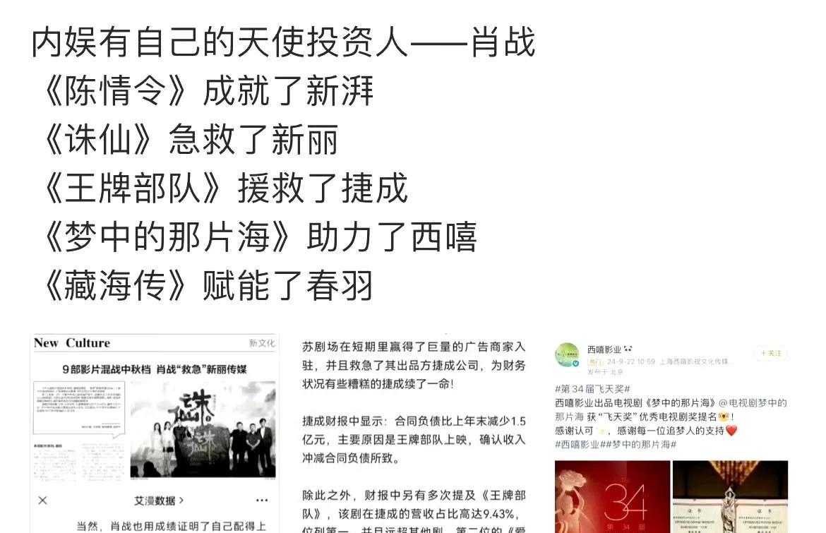 内娱有自己的天使投资人_肖战,哪个人说的,真是金句啊!肖战不愧是大家说的单人过会第一人,看看他拍的剧,虽然不多,但是部部都是赚钱的,部部都是榜上有名的,一部是巧合,多部救人于水火,就是天选了,我们肖战就是金疙瘩,是个宝贝