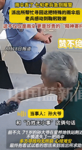 眼泪止不住了!浙江杭州,7旬老兵弄丢一把雨伞,急的赶紧来报警,不料,当民警帮忙找到之后,老兵感激的竟鞠躬道谢,而在得知原因后,也让人忍不住红了眼眶! 据中国蓝新闻8月18日的报道,事情发生在杭州,不久之前,大爷在某地铁站附近溜达时,意外把伞给弄丢了。 当时他就急的不行,想尽各种办法去寻找,可惜都没有成功,无奈之下,只好抱着试一试的心态,来到派出所寻求民警的帮助。 毕竟丢的只是把雨伞,并非是什么值钱的东西,况且离事发之时,已经过去了好几天,找起来的话恐怕难度也不小。 当了解到具体情况后,民警通过监控得知伞被人给捡走了,随后经过仔细筛查后,确定了几个可能是捡东西的人。 就这样,在挨个打电话联系后,才确定到底是哪一位,于是便成功找回了雨伞,接着就联系大爷,让他来所里拿吧。 当得知这个好消息后,大爷马不停蹄的就过来,在拿到雨伞的那一刻后,便对着民警深深的鞠了一个鞠躬。 至于大爷这样做的原因,其实是因为在他退伍后,大爷的老连长曾过来看望过他一次,这把伞就是老连长送的礼物。 同时还因为老连长在去年离开了人世,所以这把伞具有非凡的意义,不仅是大爷寄托思念的东西,更是一个精神寄托。 那么对于这件事情,您有什么想说的呢?