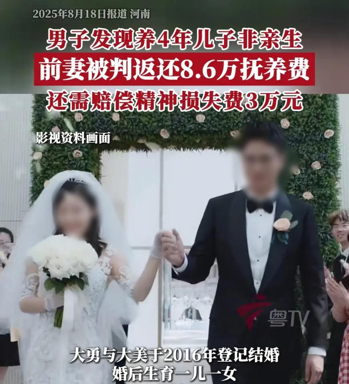 河南,男子和妻子离婚后,一双儿女跟着他居住生活,可村里人说他儿子长得不像他。男子心生怀疑,带着孩子去做了鉴定,结果发现抚养了4年的儿子并不是他亲生的,他一纸诉状,将前妻告上法庭,要求前妻支付抚养费10万元,并赔偿精神损害抚慰金3万元。 8月18日深圳新闻网报道了一起男子发现抚养了4年的儿子非自己亲生,将前妻告上法庭,索要抚养费和精神赔偿的案例。 大勇和大美结婚7年,生育了一双儿女,可自从妻子生下二胎儿子后,两人经常发生争吵。 2023年,两人协议离婚,大勇不忍心一双儿女分开,就跟大美商量:一双儿女归他抚养,大美不用承担任何抚养费用。 大美同意,两人办了离婚证,从此开启了各自的美好生活。 离婚后,大勇带着一双儿女居住生活,日子过得倒也平静幸福。 可不知从何时起,村里开始流传起一些难听的话,很多人背地里对大勇指指点点,说他傻,是个“冤大头”,戴了绿 帽子还帮别人养孩子,甚至还有人说孩子长得根本就不像他。 一开始,大勇对这些话并不相信,他觉得自己和孩子们相处多年,感情深厚,外人的几句闲言碎语,影响不到他们的父子情意。 可随着小儿子一天天长大,看着儿子和自己越来越不像的眉眼,大勇的心里也开始动摇。 他想起妻子怀二胎时对自己的冷漠,以及那段时间妻子经常外出,甚至夜不归宿的情形,他再也坐不住了。 他带着4岁的儿子去做了亲子鉴定,等待结果的日子很是煎熬,他害怕村里人的传言都是真的,同时又希望这一切只是一场误会。 可命运似乎总是喜欢捉弄人,报告显示,抚养了4年的儿子,跟他没有任何血缘关系,他不是孩子的生物学父亲。 这个残酷的现实,让大勇无法接受,回想起2016年,他和妻子登记结婚时的甜蜜场景,那时候的他们满怀憧憬,对未来的生活充满了期待。 婚后,他们的日子原本过得安稳又惬意,为了让家人过上更好的生活,大勇努力工作;大美则在家操持家务,照顾孩子,一家人其乐融融。 可谁能想到,自从小儿子出生后,一切都变了,妻子的冷淡、家庭的变故,让原本幸福的家庭变得支离破碎。 之前,大勇一直以为是自己哪里做的不够好,没有达到妻子的要求。 直到这一刻,他才明白,大美早就背叛了自己和这段婚姻,他实在咽不下这口气。 大勇一纸诉状,将大美告上了法庭,要求大美支付抚养费,并赔偿精神损害赔偿。 1、大美承认孩子非大勇亲生,大勇的诉求是合理且有法律依据的。 《民法典》第26条规定:父母对未成年子女负有抚养、教育和保护的义务。 大勇提交亲子鉴定结果后,大美对这一结果予以认可,确认了小儿子跟大勇不存在亲子关系。 若孩子非亲生,且因另一方的过错导致,如隐瞒真相、欺诈等,受欺骗方有权要求过错方赔偿。 在本案中,大勇虽非孩子的亲生父亲,但是他在不知情的情况下,实际履行了对孩子的抚养义务,为孩子的成长付出了大量的精力和财力。 而大美作为孩子生母,在明知道孩子不是大勇亲生的后,还把孩子留给大勇抚养,未尽到相应的抚养责任。 大美的行为违背了夫妻忠实义务,她侵害了大勇的财产权利,大勇有权要求大美返还他在抚养孩子期间所支出的合理费用,包括生活费、教育费、医疗费等。 2、大勇还可主张精神损害赔偿。 与第三人生育子女和欺诈性抚养行为,均可认定为有其他重大过错。 大美与第三人生育子女,并欺骗大勇抚养,使大勇遭受了严重的精神痛苦,并且导致其名誉受损。 法院对于大勇主张的要求大美支付精神损害抚慰金的诉求予以支持。 最终,法院判决大美向大勇支付86808元抚养费、鉴定费等,并向大勇赔偿3万元精神损害抚慰金。 3、非婚生子女和婚生子女享有同等权利,大美可向孩子生父主张抚养费。 《民法典》第1071条规定:非婚生子女享有与婚生子女同等的权利,任何组织或者个人不得加以危害和歧视。不直接抚养非婚生子女的生父或者生母,应当负担未成年子女或者不能独立生活的成年子女的抚养费。 如果大美知道孩子的生父是谁,如生父没有直接抚养孩子,大美可要求对方支付孩子的抚养费。 无论如何,跟他人发生婚外情是不可取的,这种行为违背了夫妻忠实义务,有悖于公序良俗,也有可能会连累到无辜的孩子。 关注@律觀法说 ,从法律角度看世界,感受不一样的人情冷暖。 #万能生活指南# #万能生活指南#