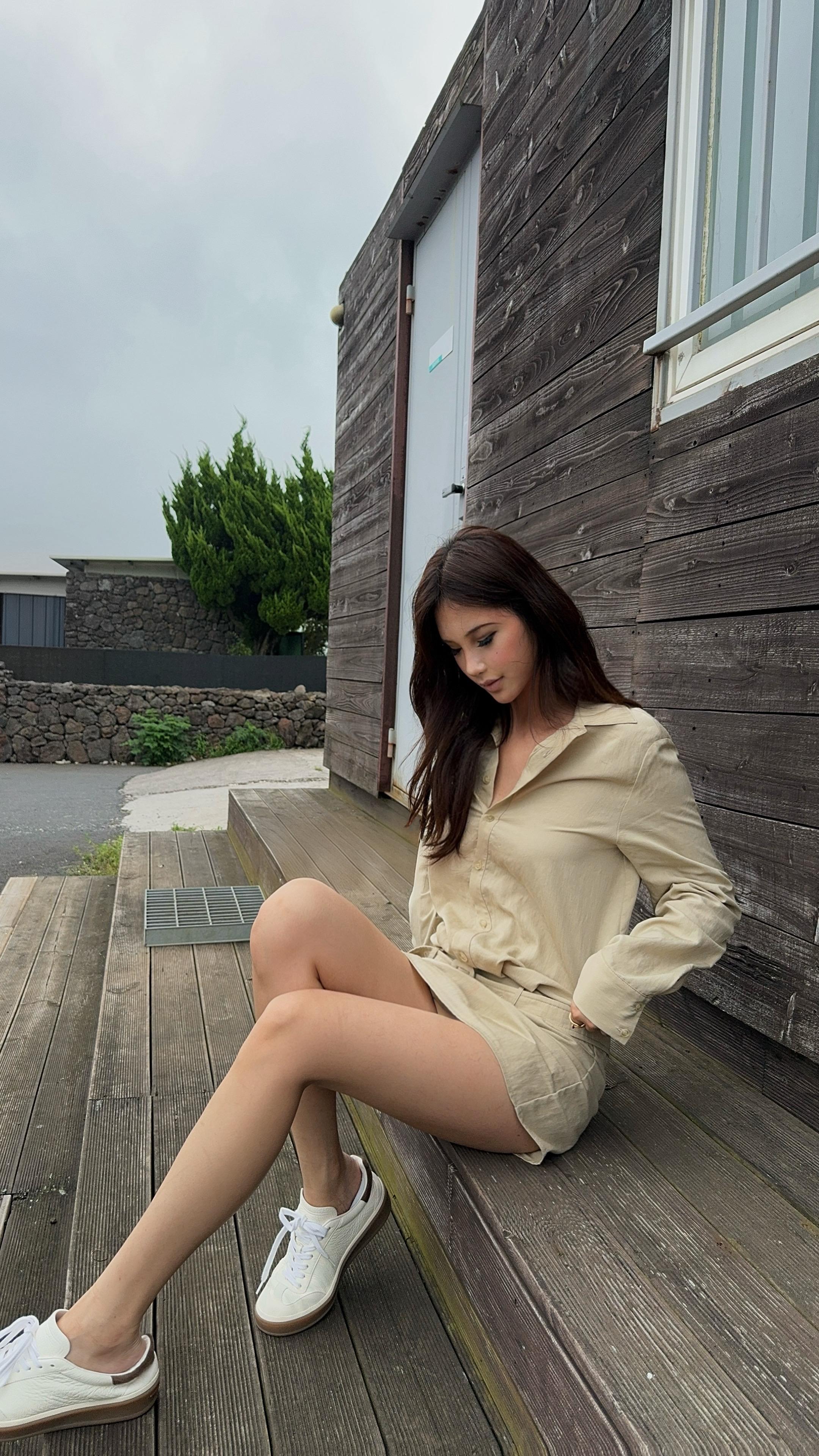 林间步道浸着海的风,白衫和薄荷色短裤刚好接住夏天的松弛感。远处蓝得发透的浪,是今