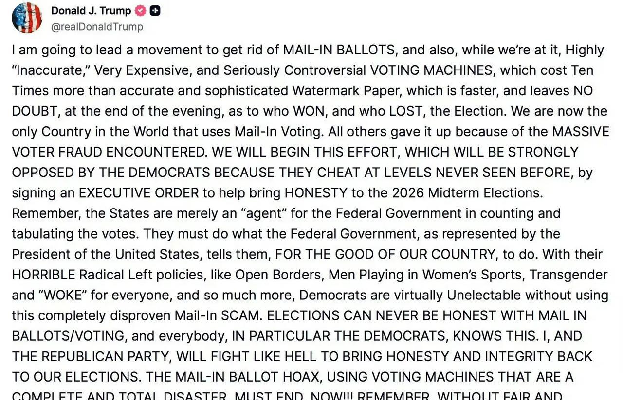 美国的选举方式彻底变天,民主党估计要炸锅了! 特朗普将签署行政命令,2026年中期选举前,全面取消邮寄选票和投票机:“邮寄选票骗局、使用投票机,必须立即结束!”