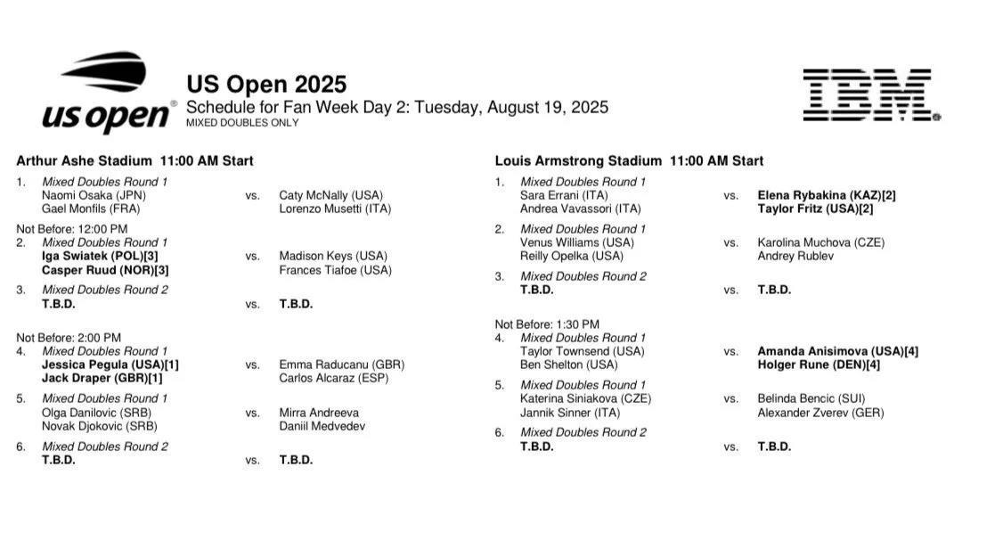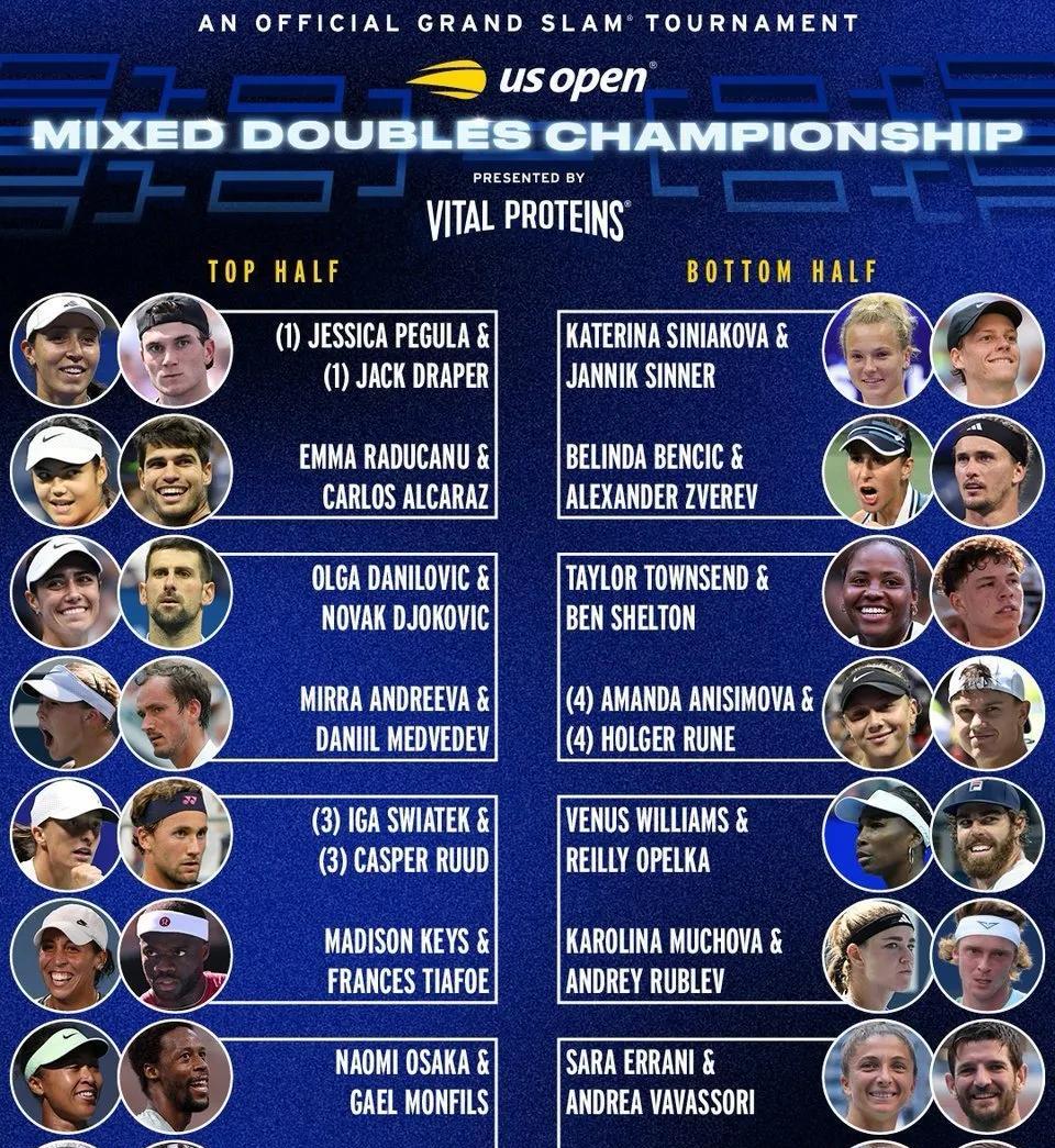 2025美国网球公开赛混双签表揭晓。小德/达尼洛维奇首轮对阵梅德韦杰夫/小安德烈