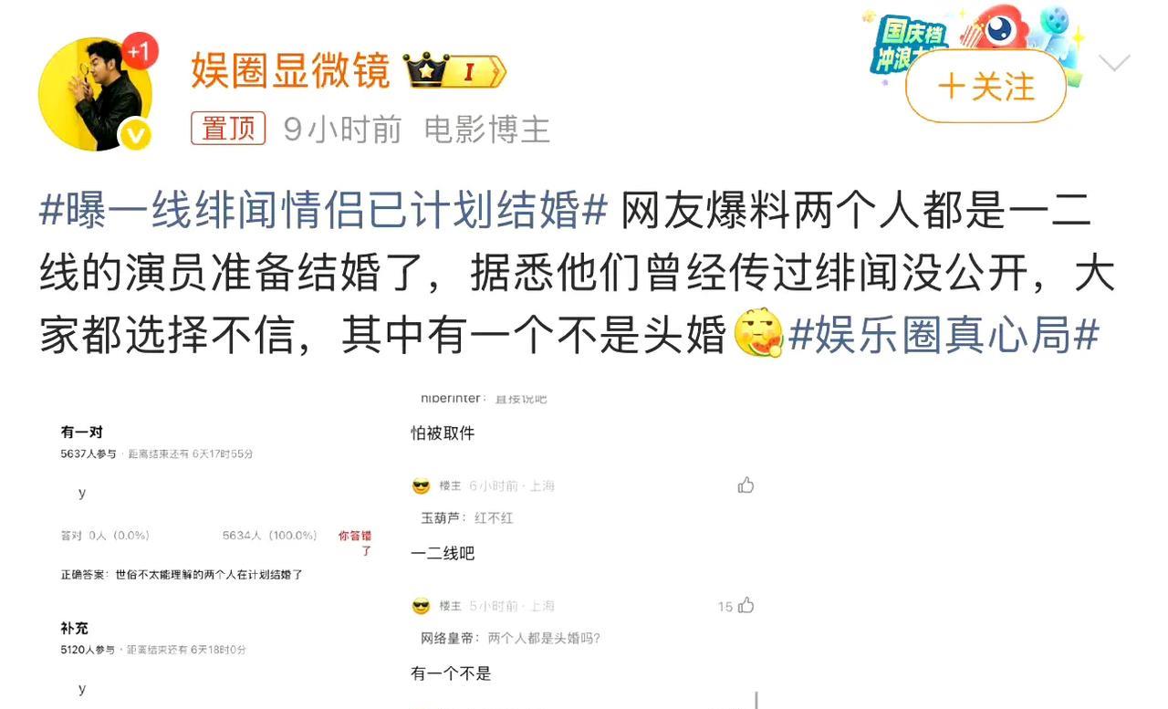 《惊爆!网友爆料:两一二线演员隐秘婚讯将至,曾传绯闻未公开,一人非头婚?》#超一线女星恋情# #一线男星恋情# #女演员绯闻# #绯闻男演员# #明星恋情曝光# #演员恋情# #娱乐圈恋情瓜#