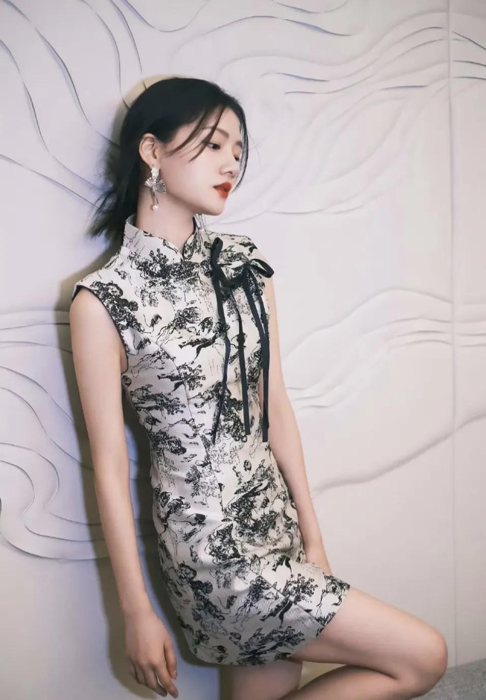 任敏新中式水墨旗袍,小小只穿旗袍也别有韵味。