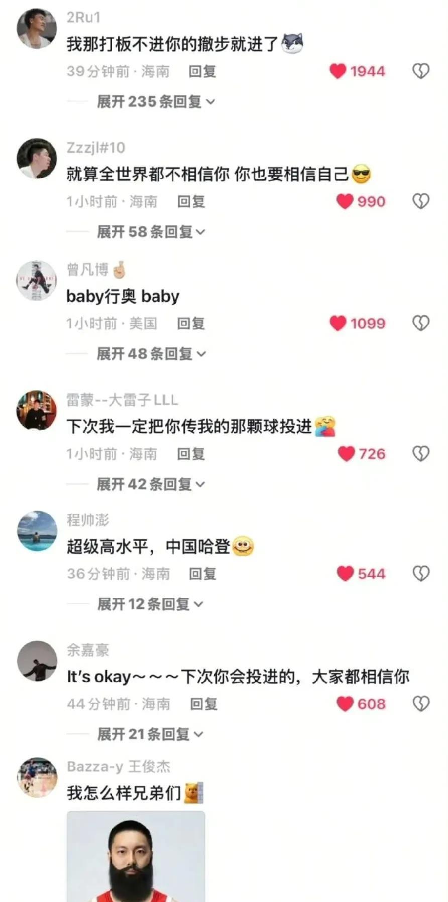太暖心了!胡明轩发布动态表示绝杀不进的遗憾之后,中国男篮的兄弟们集体留言鼓励,真的团结,让人泪目! 赵睿评论:我那打板不进,你的后撤步就进了! 胡明轩回复:差一点点运气! 王俊杰晒出胡明轩大胡子的照片,并评论写道:我怎么样兄弟们? 胡明轩回复:小孩,你又调皮了! 曾凡博评论:baby行奥baby! 胡明轩回复:好好康复,就差你了! 程帅彭评论:超级高水平,中国哈登! 胡明轩回复:程普森你好! 余嘉豪评论:It’s okay~下次你会投进的,大家都相信你! 朱俊龙评论:就算全世界不相信你,你也要相信你自己! 雷蒙评论:下次我一定把你传我的那颗球投进去! 真的是非常喜欢这支团结又暖心的中国男篮,这才是我们所爱的中国男篮!