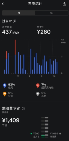 特斯拉焕新Y长续航:目前北京日均温度在35度左右,早起温度应该在26度左右,车内空调22度,通勤单程距离11公里,偶尔急加速深踩,平均电耗13-16(取决于急加速的频率和力度),到公司表显78%,停在公司地面停车场一天,哨兵+40度温度保护,下班车机表显电量在65-67%左右,到家大概63%-65%左右,回家就插枪充电到80%,每天电耗约13度电,北京家充不分峰谷表,电价收费0.477/度,费用约13×0.477=6.201/天(每天往返22公里+全天哨兵+40度过热保护AC),这个费用我觉得还可以接受,不低,主要是因为40度空调过热保护,我尝试了下午大太阳室外39度左右不开空调过热保护,车内最高温度49度左右,下班时表显剩余电量75%,到家约73%,也就是开一天过热保护,会比不开AC(无AC过热保护)多耗电8%-10%左右,也就是7.8度电(7.8×0.477=3.7206元/天),这个就看个人情况,如果觉得车里晒一晒无所谓,快下班再开空调,一天无AC过热保护基本能比40度过热保护AC省出3.7元左右/天,这个数据也要取决于当天温度和太阳大小以及室内室外停放的情况。 特斯拉的空调功率非常给力,基本3分钟-5分钟,可以把车内温度从49度降到26度左右,加上座椅通风,非常凉爽,早买早享受,晚买享折扣。