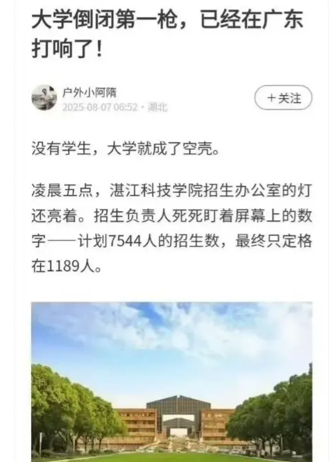 鲸鱼whale 9 2025-08-20 19:04 现在小学刚刚过了人口高峰期,还没传递到大学呢,现在大学还招不到学生的不能怪大环境,问题就在自己身上 楓橋ぉ聽雨 回复 鲸鱼whale 08-28 00:51 麻烦小学读完再来评论 鲸鱼whale 回复 08-21 13:02 第一大学是全国招生 本省生源最多,第二湛江不在东北