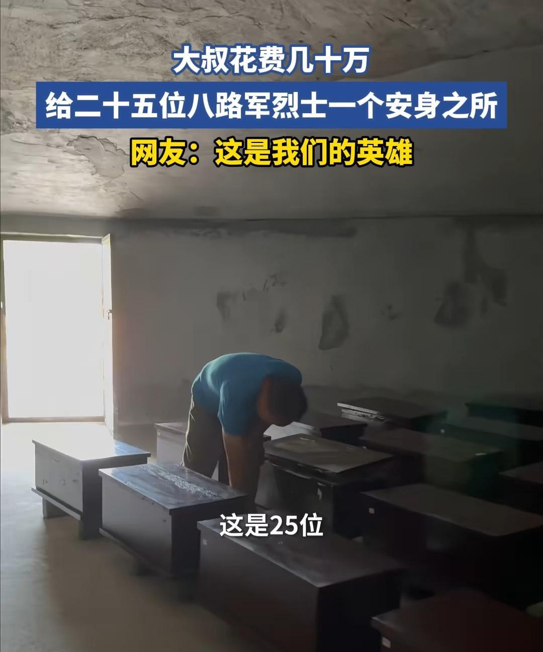 “这位大叔火了!”山西,50岁男子借款几十万,不是为了买房,也不是为了买车,甚至现在还在为女儿的学费犯愁,他竟然将这些钱在数十年的时间里给25位“无名八路军烈士修建了一个安息之处”!家里外债还有的没还完,大钱又挣不来,妻子还因此经常埋怨他,但是他一直坚持到今天。网友:“真的看哭了”! 2010年的深秋,在山西阳泉某处贫瘠的山坳里,郭海波弯着腰,将肩上最后一袋水泥重重卸下,溅起的粉尘扑了他一脸。 而这袋水泥,是他用自家地里刚收的三斤豆角,跟邻村砖厂磨了半天嘴皮子才换来的。 他抹了把汗,望着眼前初具轮廓的陵园地基。 为了这片安息之地,他已欠下几十万外债,女儿的学费至今没有着落。 然而,他却始终坚持着要为二十五位长眠太行山深处、姓名湮灭于战火的无名八路军烈士,建一个真正的“家”。 这十六年的坚守,始于一本泛黄的登记册! 上世纪九十年代末一次偶然的旧货市场淘书,郭海波在一堆故纸堆里,发现了一本边缘卷曲的登记册。 册子内页,密密麻麻的记录下来十个地点。 某年某月某日,某处山梁、某条沟壑,有八路军战士牺牲于此。 有些关键的信息,牺牲者的姓名、籍贯,一概空缺,更多的是字迹潦草,信息模糊。 而这些陌生的地标,指向了太行山深处一个个无名的坟茔。 郭海波的心像被狠狠揪了一下。 那些年轻的身影在战场上浴血奋战,然而倒下后却连个像样的墓碑都没有。 他想着“不能让英雄无名!” 而彼时的郭海波,不过是个普通下岗工人,家境清贫,生活拮据。 然而,一种源自血脉深处的朴素情感与历史责任感,驱使着他踏上了这条常人难以想象的寻骨之路。 太行山,峰峦叠嶂,沟壑纵横,要想寻找半个多世纪前的战场遗迹和散落遗骨,无异于大海捞针。 但是他没放弃,郭海波蹬着一辆破旧自行车,车后座绑着干粮袋和水壶,开始了漫长的跋涉。 他循着登记册上的线索,深入人迹罕至的山林。 山路崎岖,他无数次崴伤脚踝,甚至险些从陡峭的山崖跌落。 最危险的一次,他在攀爬一处风化严重的坡地时,脚下碎石突然松动,整个人向下滑坠,情急之下死死抓住一丛酸枣枝才幸免于难。 寒来暑往,风雨无阻。 他像考古者,在荒山野岭间细细搜寻。 有时是半截锈蚀的皮带扣,有时是一颗变形的弹头,更多时候,是深埋于泥土之下、早已与山石融为一体的森森白骨。 每一次捧起遗骨,用红布包裹好,他的心头都沉甸甸的。 十年光阴,头发白了,皱纹更多了,但是他用脚步丈量着太行的每一寸土地,最终将二十五位无名烈士的遗骸一一寻回。 遗骸寻回,仅仅是第一步。 郭海波还想为这些无名英雄修建一座体面的陵园,让他们有尊严地安息,也让后人有个凭吊追思之所。 然而,修建陵园需要钱! 这对于一个靠打零工和种几亩薄田糊口的家庭来说,这无异于天文数字。 随后,郭海波决定:“借钱!” 他拉下脸皮,走亲访友,磨破嘴皮子,甚至不惜借下高息贷款。 几十万元的债务,死死压在了这个本就清贫的家庭头上。 家里的积蓄早已耗尽,原本宽敞些的老屋,被他腾出来改造成了简易的“无名烈士纪念馆”,里面摆放着他四处搜集来的抗战遗物和老照片。 而他和妻子、女儿,则挤进了旁边低矮破旧的偏房。 家中不断有上门要债的债主,而女儿甚至练一件新衣服都没钱买,家中的米面也快吃完了。 这个时候,妻子终于忍不住埋怨:“闺女学费都快凑不齐了,你管那些死人干啥?这日子还过不过了?” 亲戚朋友也是不理解:“老郭这是魔怔了?”“有这钱,给自家盖个新房不好吗?” 面对质疑和生活的重压,郭海波往往只是低头抽着旱烟:“没有他们当年拼命,哪来咱们今天?他们连个名字都没留下,咱不能让他们连个安身的地儿都没有。” 他怕后人忘了,怕这些为国捐躯的忠魂被历史彻底掩埋。 为了省钱,郭海波几乎成了全能工匠。 买不起建材,他就自己上山开凿石块。 没钱雇工人,他就用自家种的蔬菜粮食去抵偿乡邻的帮工。 陵园的一砖一瓦,一土一石,都有着他的汗水与心血。 2010年那个秋天,当他终于将最后一袋水泥卸在陵园工地时,陵园的主体工程才算艰难落成。 二十五块青石碑依山而立,虽无烈士姓名镌刻,却庄严肃穆。 陵园建成后,郭海波每天都会去陵园清扫落叶,擦拭石碑,拔除杂草。 即使最初门可罗雀,鲜有人知,他也风雨无阻。 他守着这片陵园,最大的心愿,是希望有一天,这些无名烈士的身份能被确认,他们能“回到自己真正的家”。 后来,随着媒体报道,郭海波的事迹逐渐传开。 陵园开始有人前来祭扫,一束束野花,一杯杯清酒,寄托着后人的哀思与敬意。 他觉得,这十六年的付出,值了。 为国捐躯者,不应被遗忘。