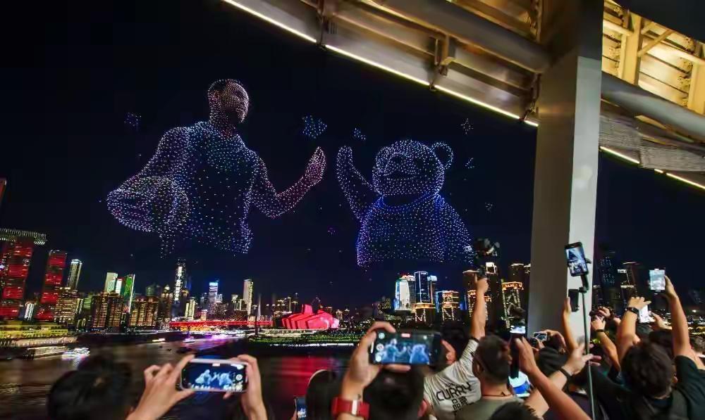 重庆太懂整活了, 库里来重庆, 马上“专属”无人机大秀安排起。 库里同渝爱空中击掌,两大顶流实现梦幻联动; 库里遇上酷城,再高温都抵不过来自全国球迷的热情; 库里经典名场面重现,晚安重庆,一路跟随的库里迷们昨晚定然都睡了个好觉。 这两天国博中心估计一直会人山人海……#库里中国行对重庆有哪些积极影响# #库里观看重庆无人机表演# #库里# #库里重庆行# #库里的重庆行#