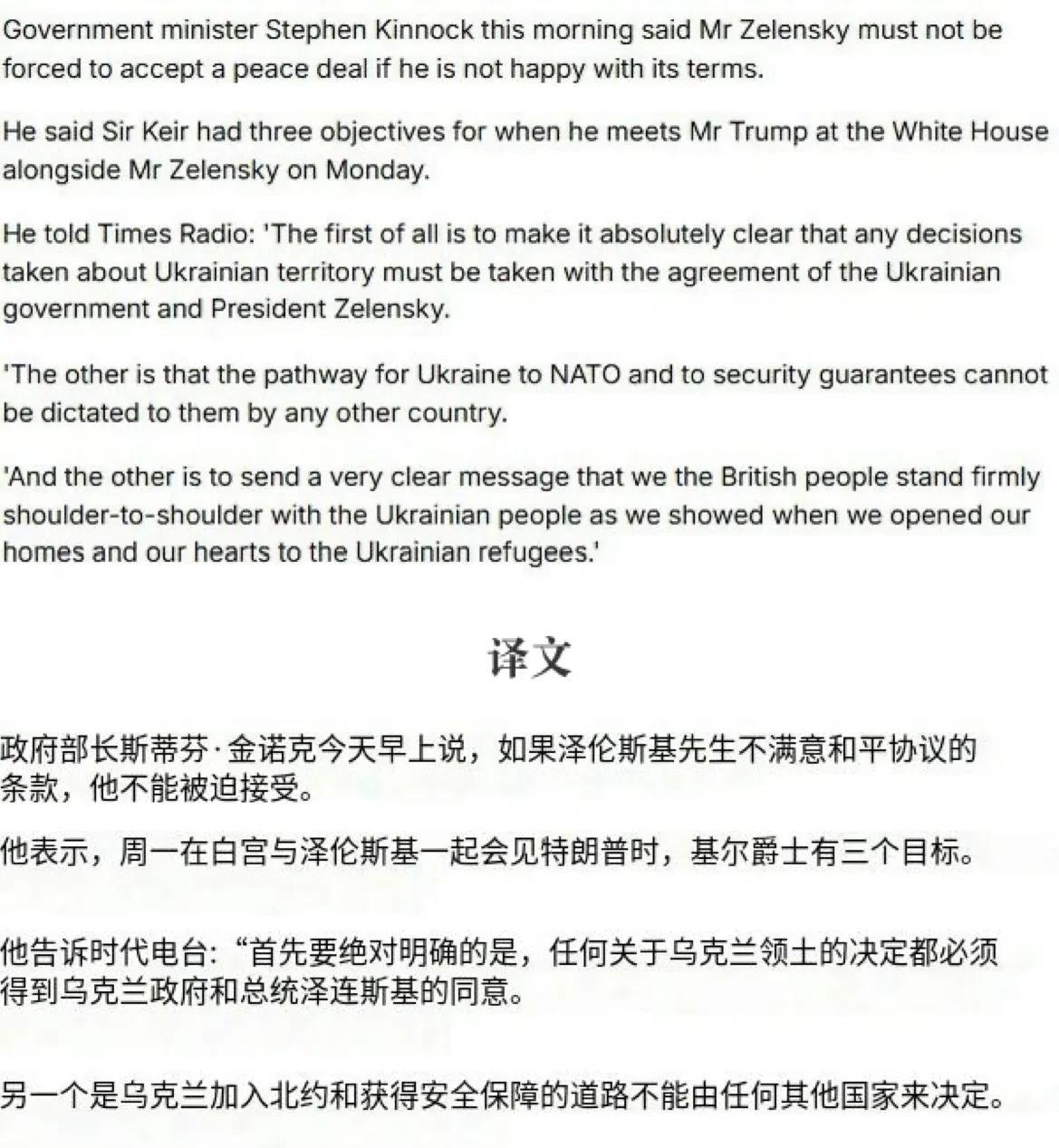 【英国官员称不能强迫泽连斯基接受协议】 据外媒消息,英国国务大臣斯蒂芬·基诺克表示,如果泽连斯基对和平协议条款不满意,那么他就不能被强迫接受。 斯蒂芬·基诺克还表示,任何有关乌克兰领土的决定都必须由乌克兰政府和泽连斯基作出决定。 另外,斯蒂芬·基诺克再次明确英国始终会与乌克兰站在一起,并强调乌克兰加入北约应由自己决定,而不是由其他国家来决定。